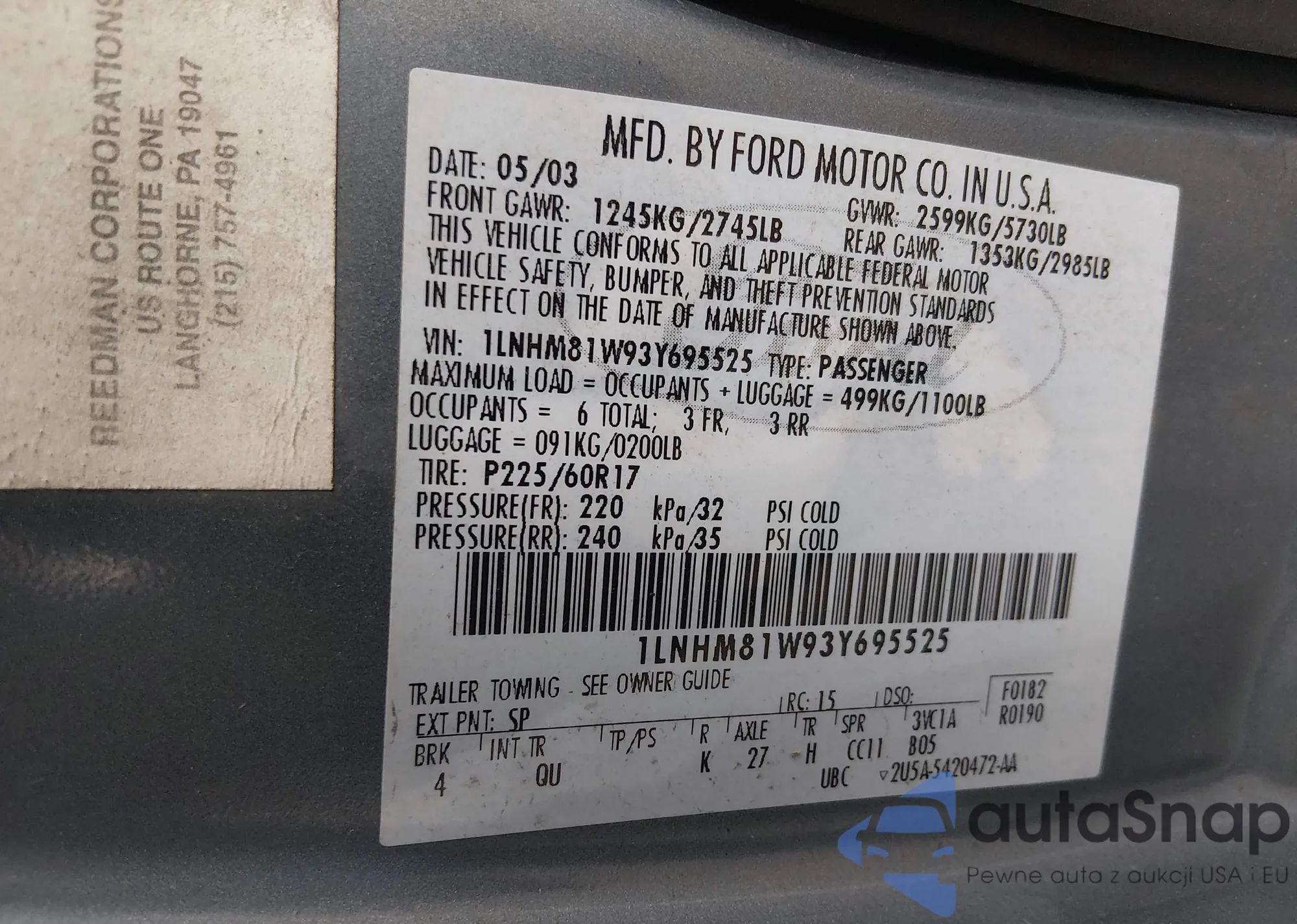 • VIN 1LNHM81W93Y695525