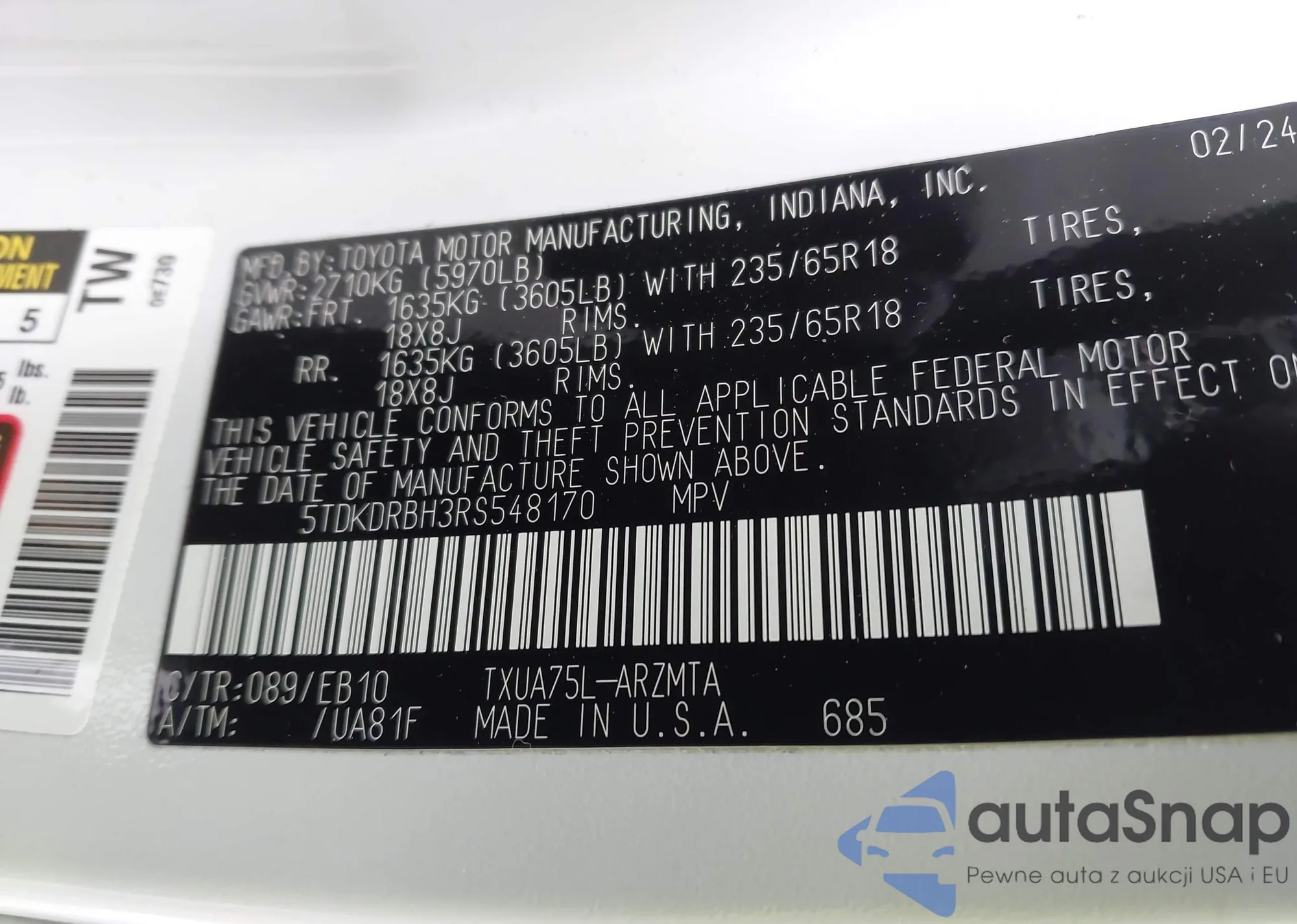 LOT: 43873117 VIN: 5TDKDRBH3RS548170