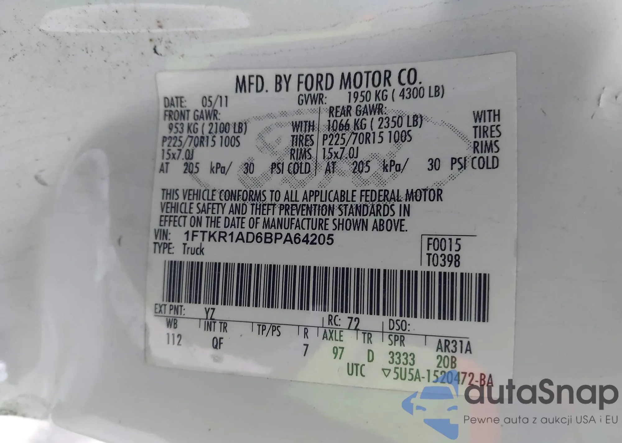 LOT: 44257370 VIN: 1FTKR1AD6BPA64205