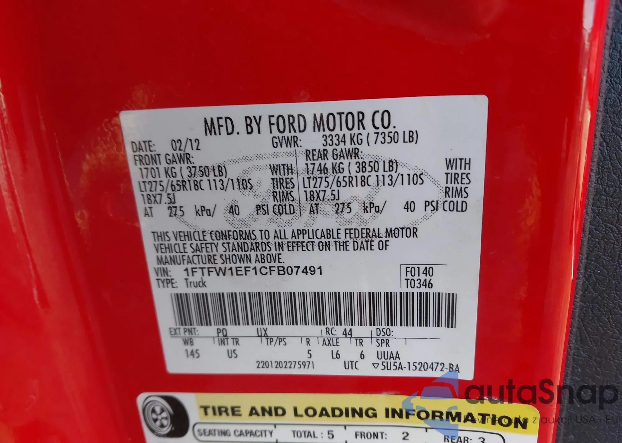 LOT: 44223871 VIN: 1FTFW1EF1CFB07491
