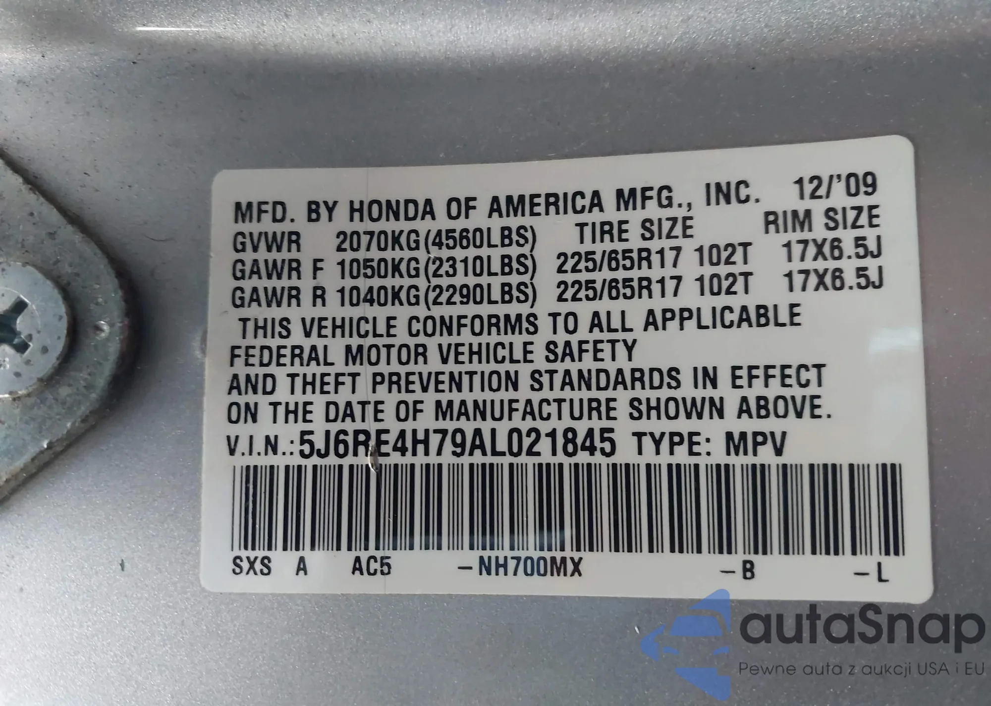 • VIN 5J6RE4H79AL021845