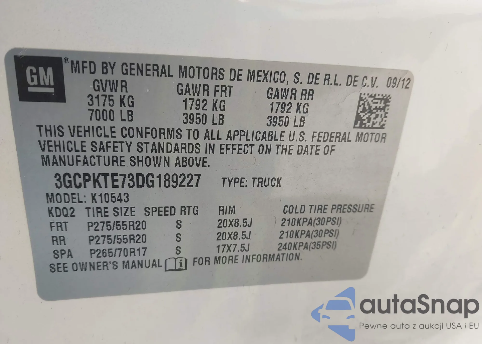 LOT: 43865982 VIN: 3GCPKTE73DG189227