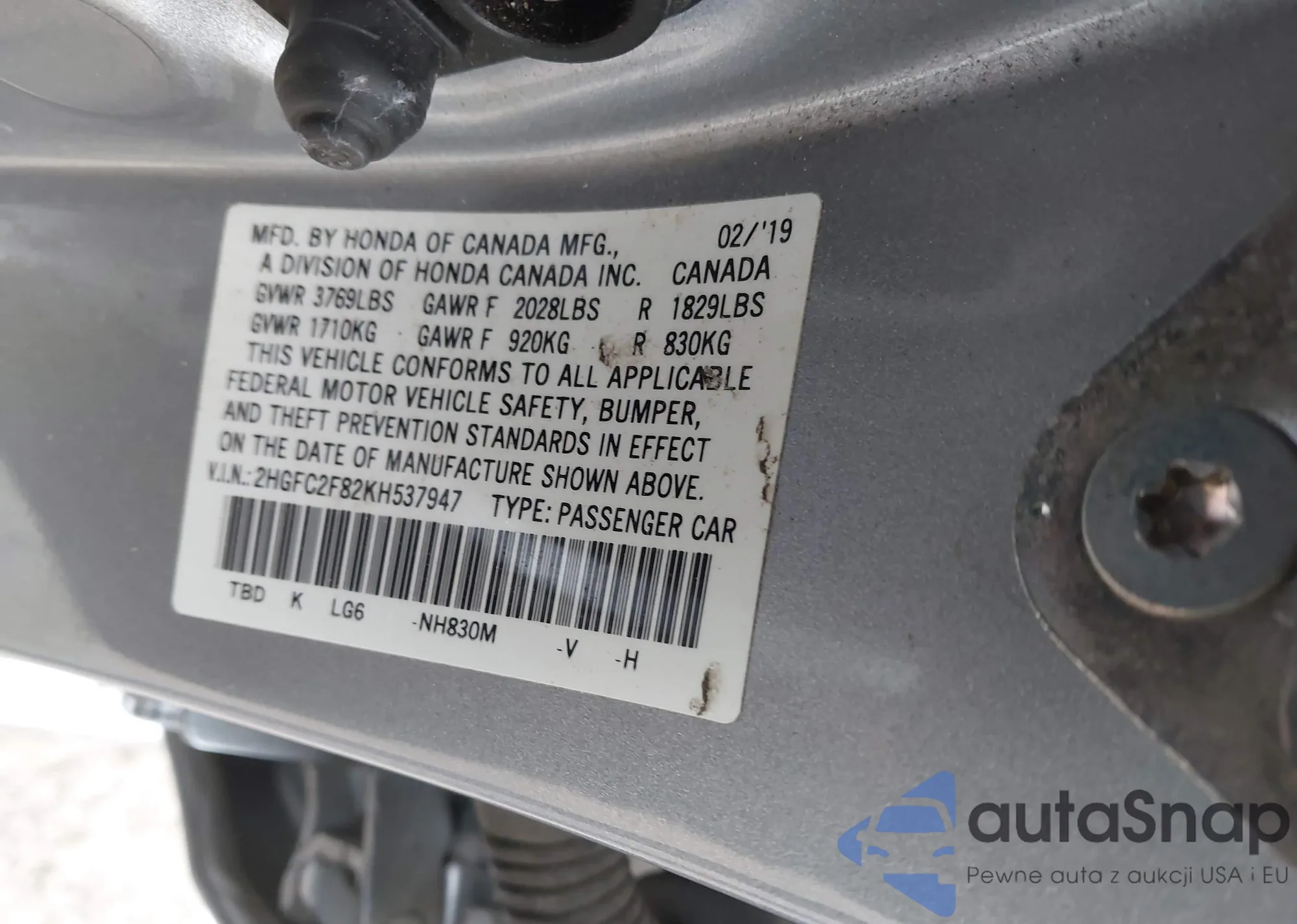 • VIN 2HGFC2F82KH537947