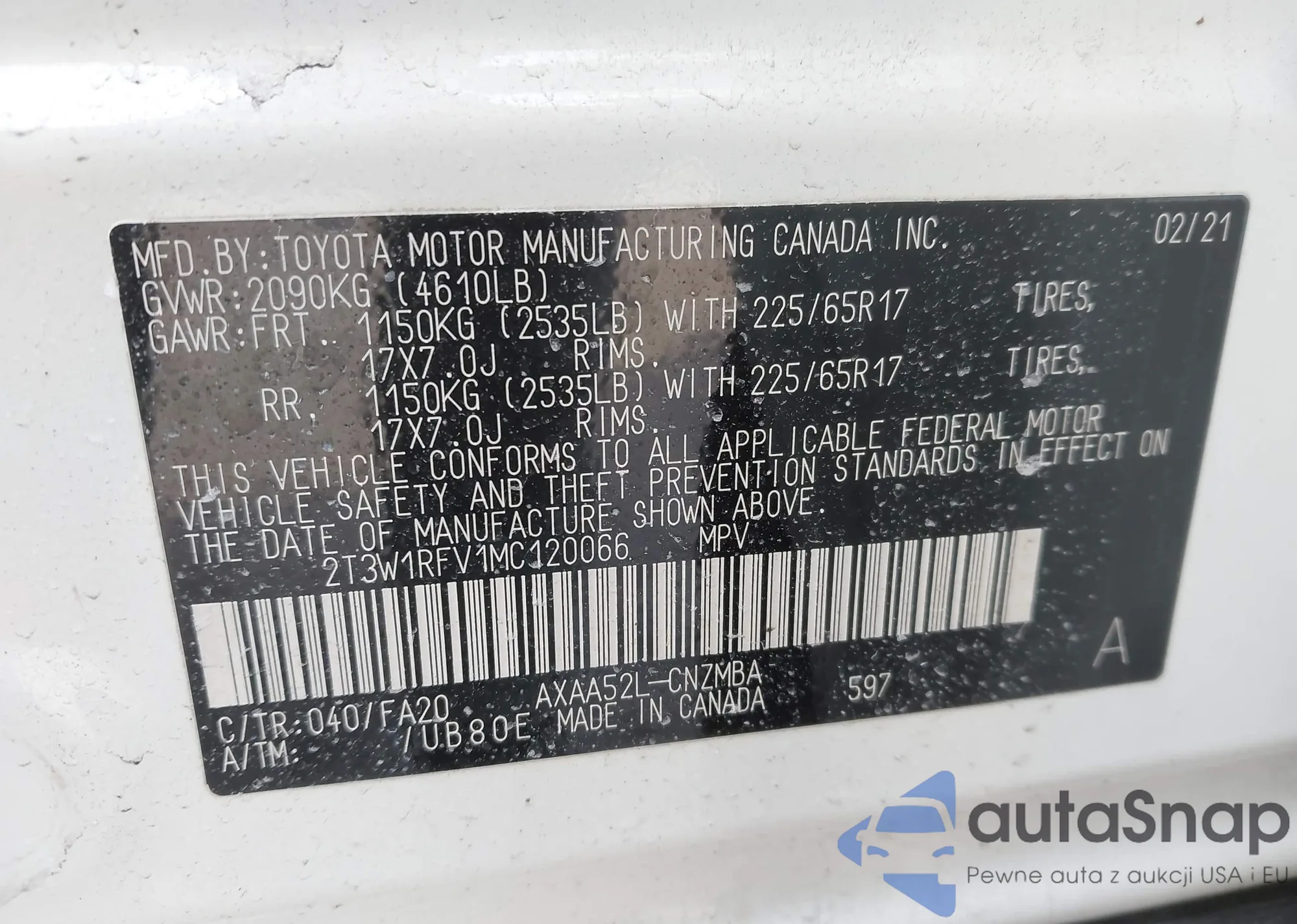 LOT: 44132576 VIN: 2T3W1RFV1MC120066