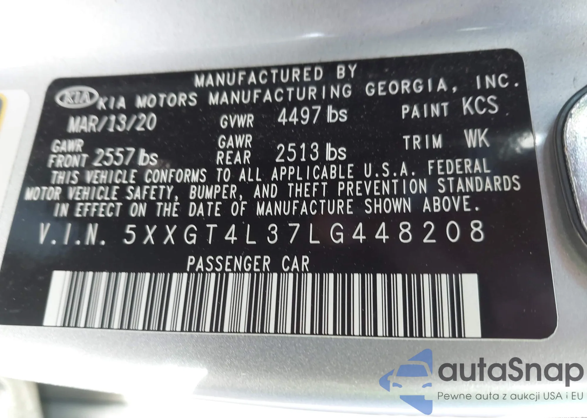 LOT: 44291377 VIN: 5XXGT4L37LG448208