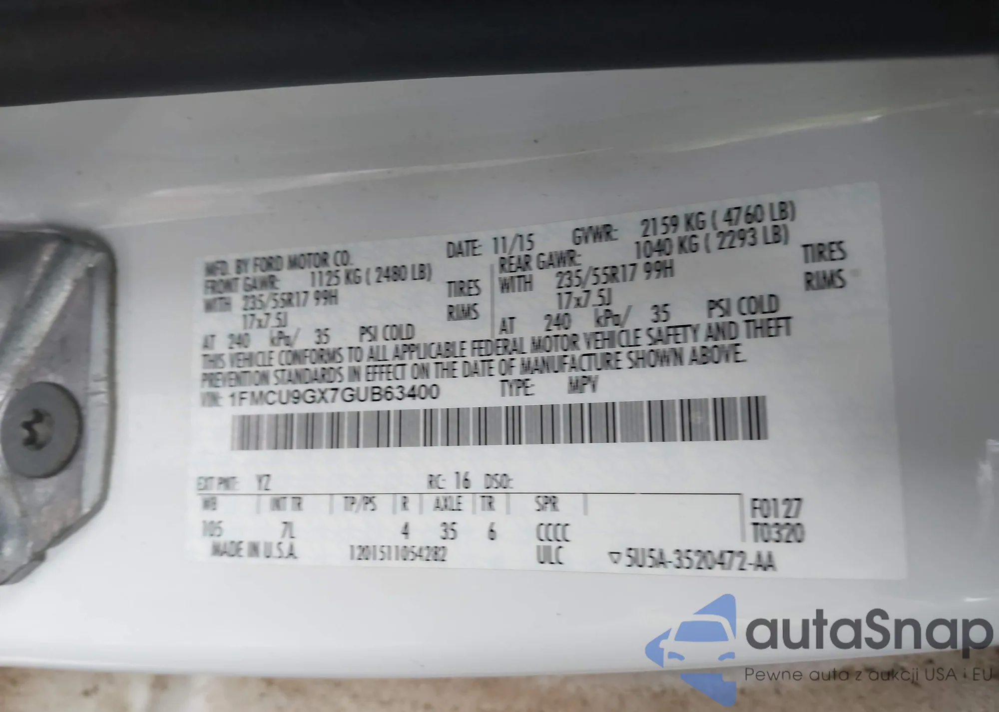 • VIN 1FMCU9GX7GUB63400