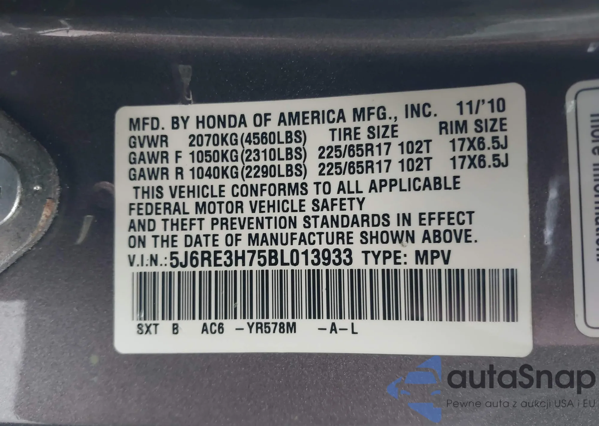 • VIN 5J6RE3H75BL013933