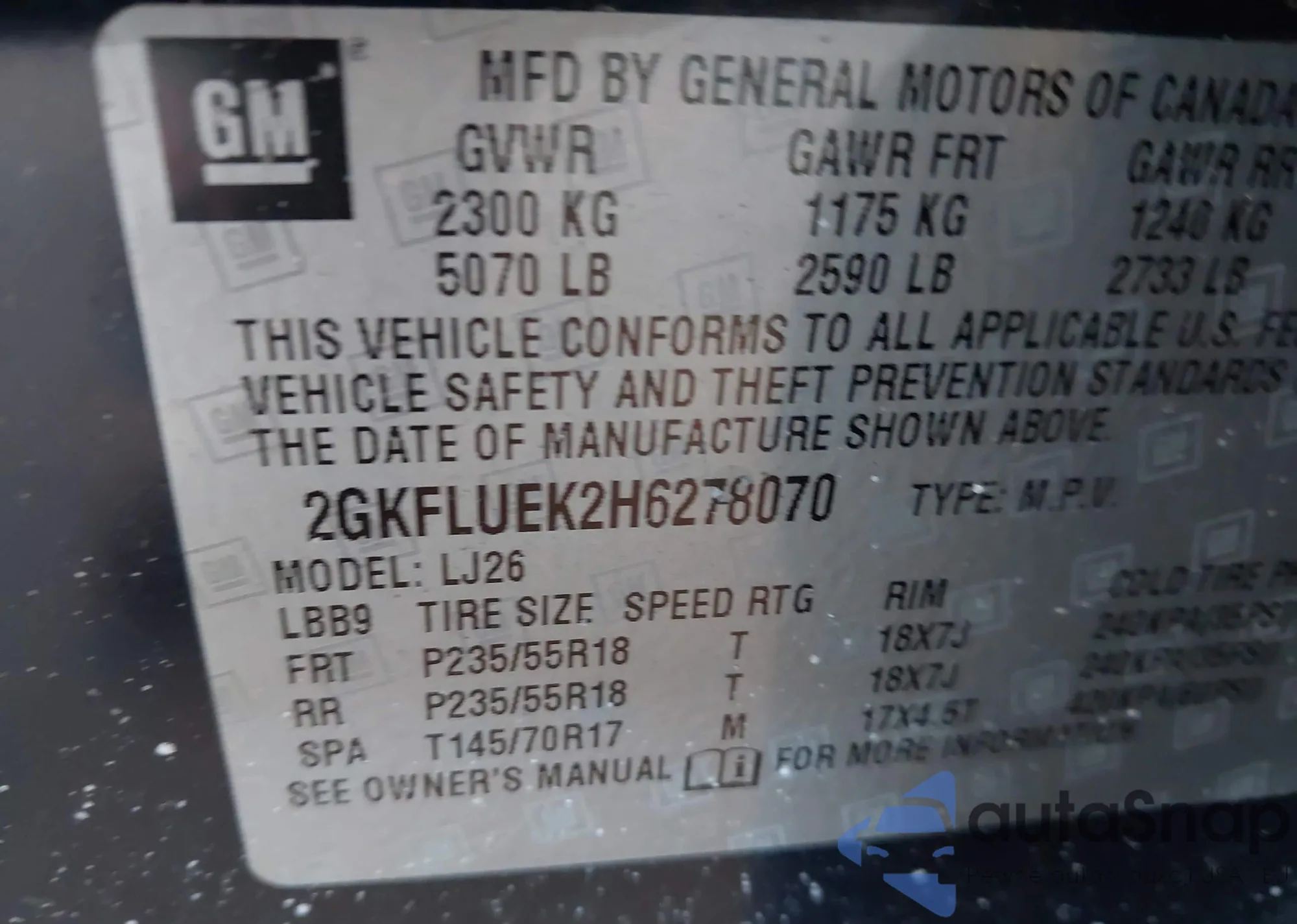 • VIN 2GKFLUEK2H6278070