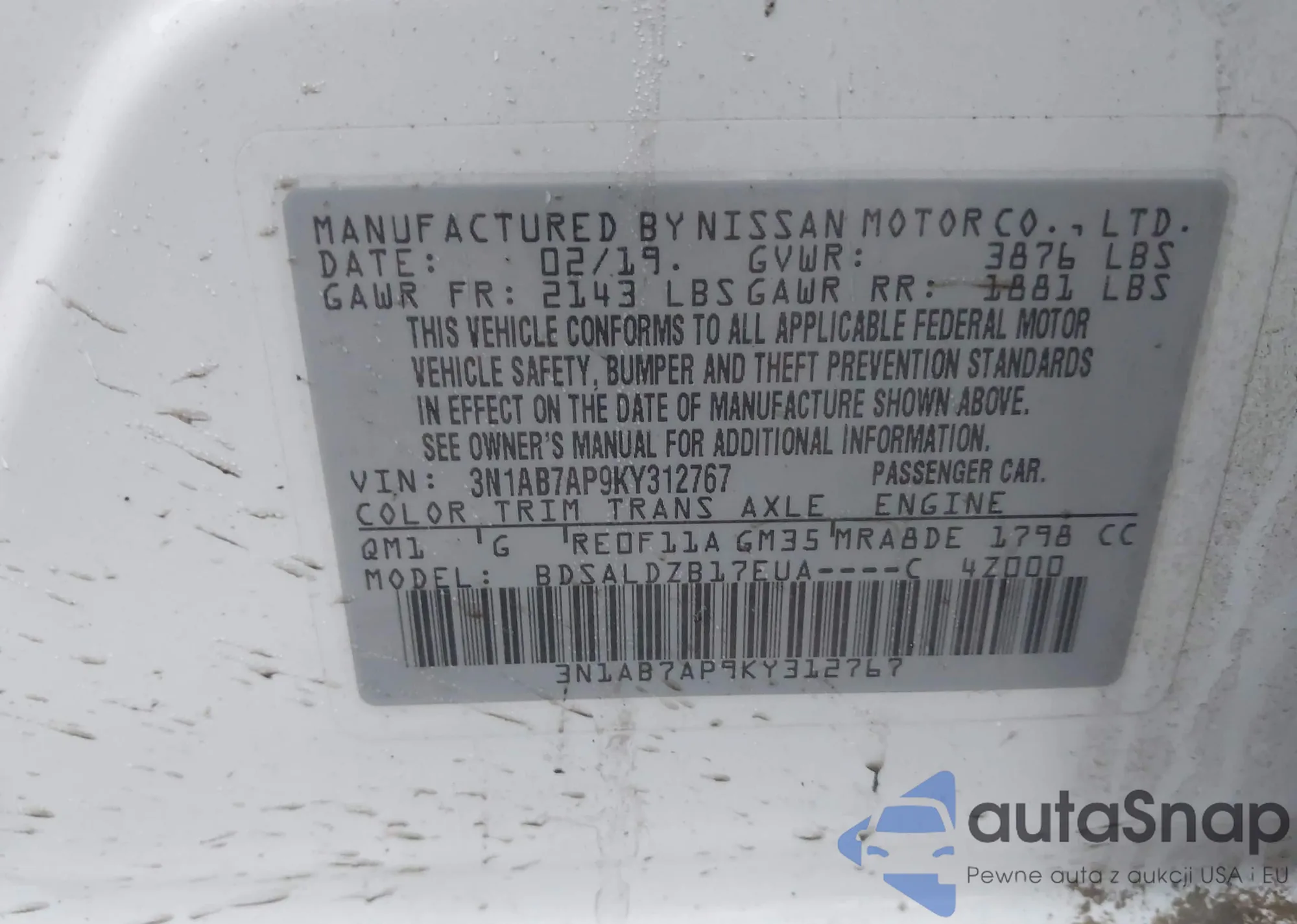 LOT: 44161315 VIN: 3N1AB7AP9KY312767