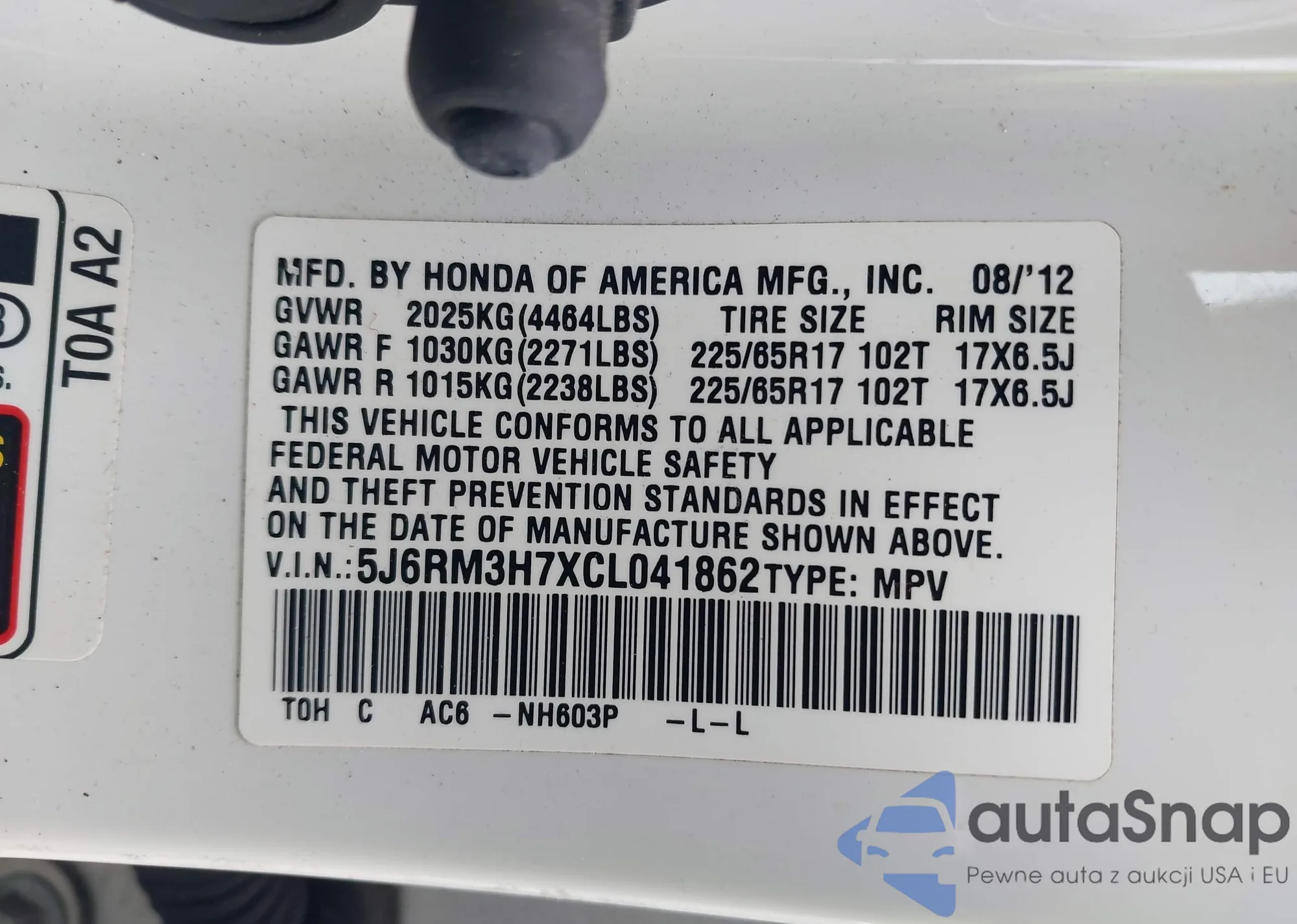 • VIN 5J6RM3H7XCL041862