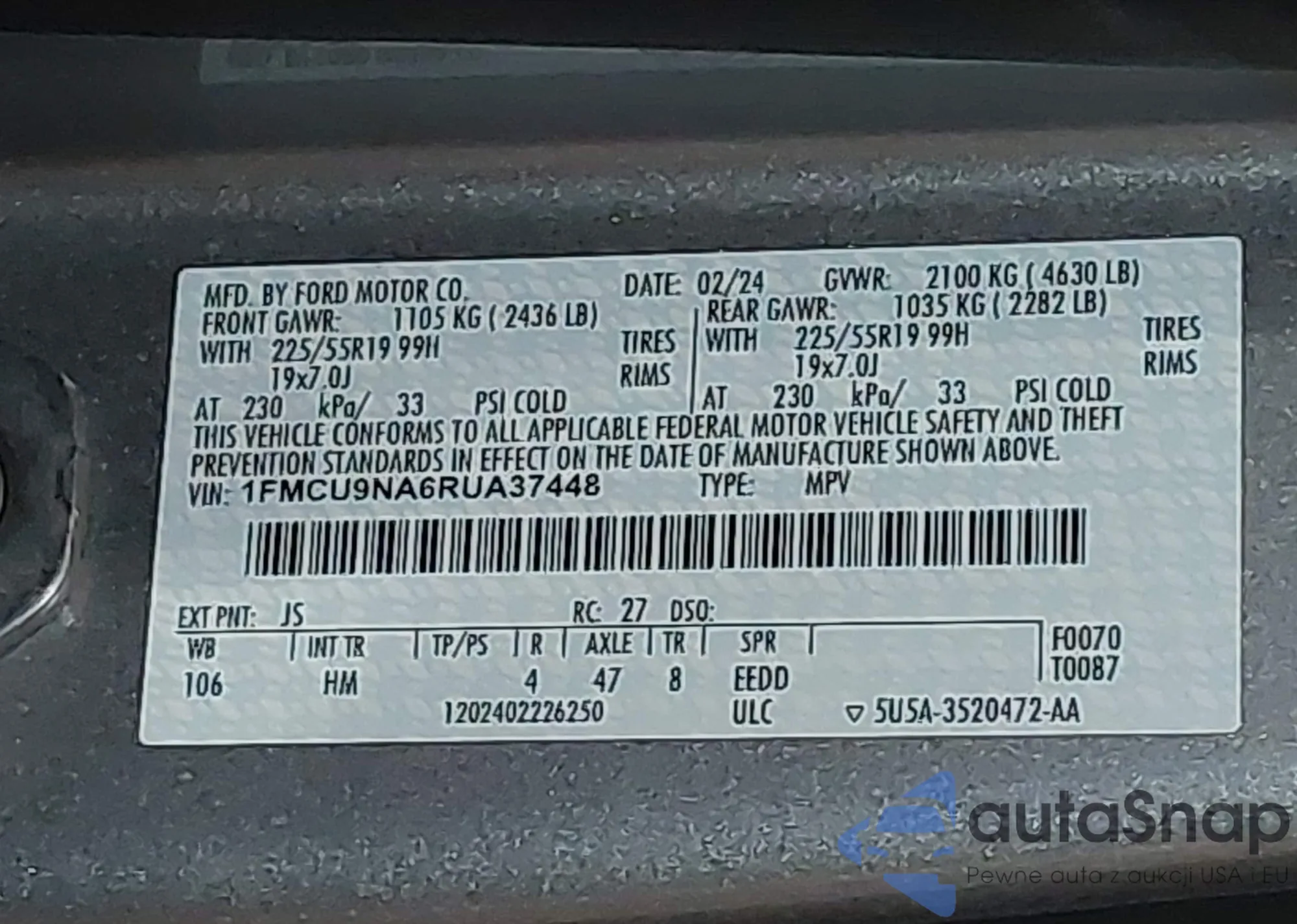 • VIN 1FMCU9NA6RUA37448