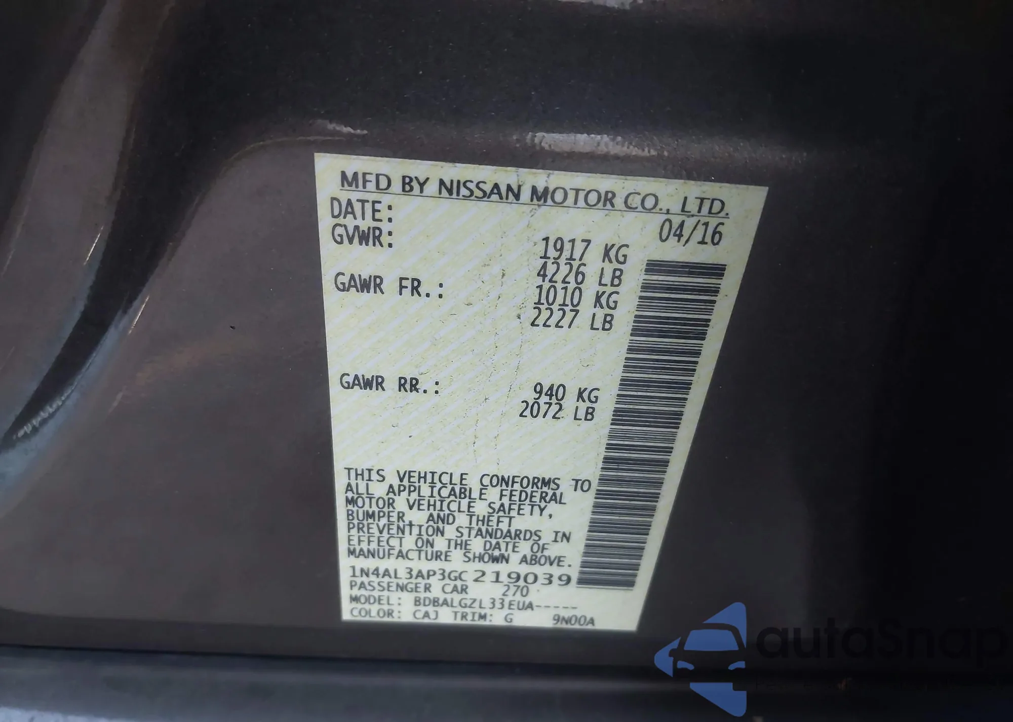• VIN 1N4AL3AP3GC219039