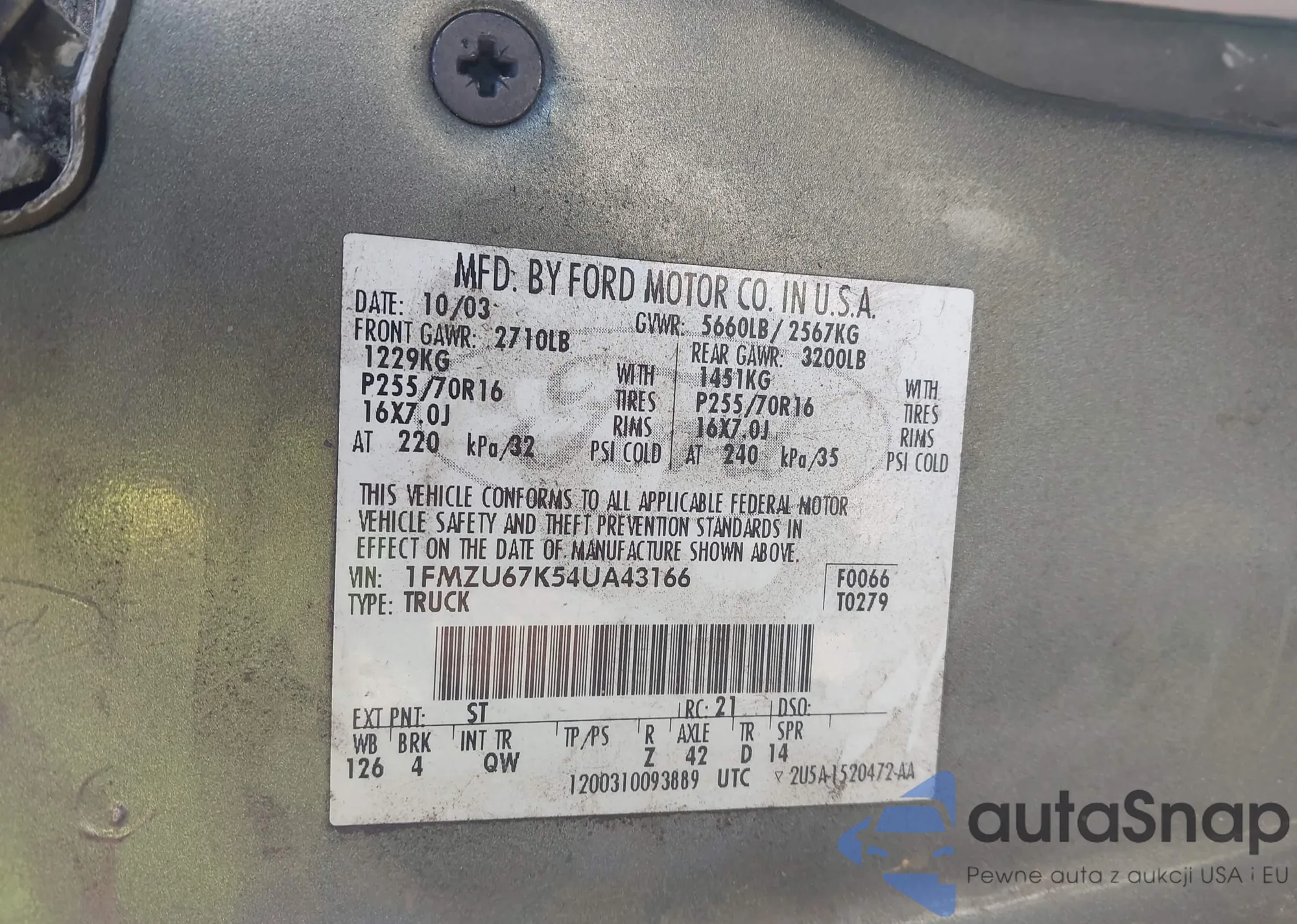 • VIN 1FMZU67K54UA43166