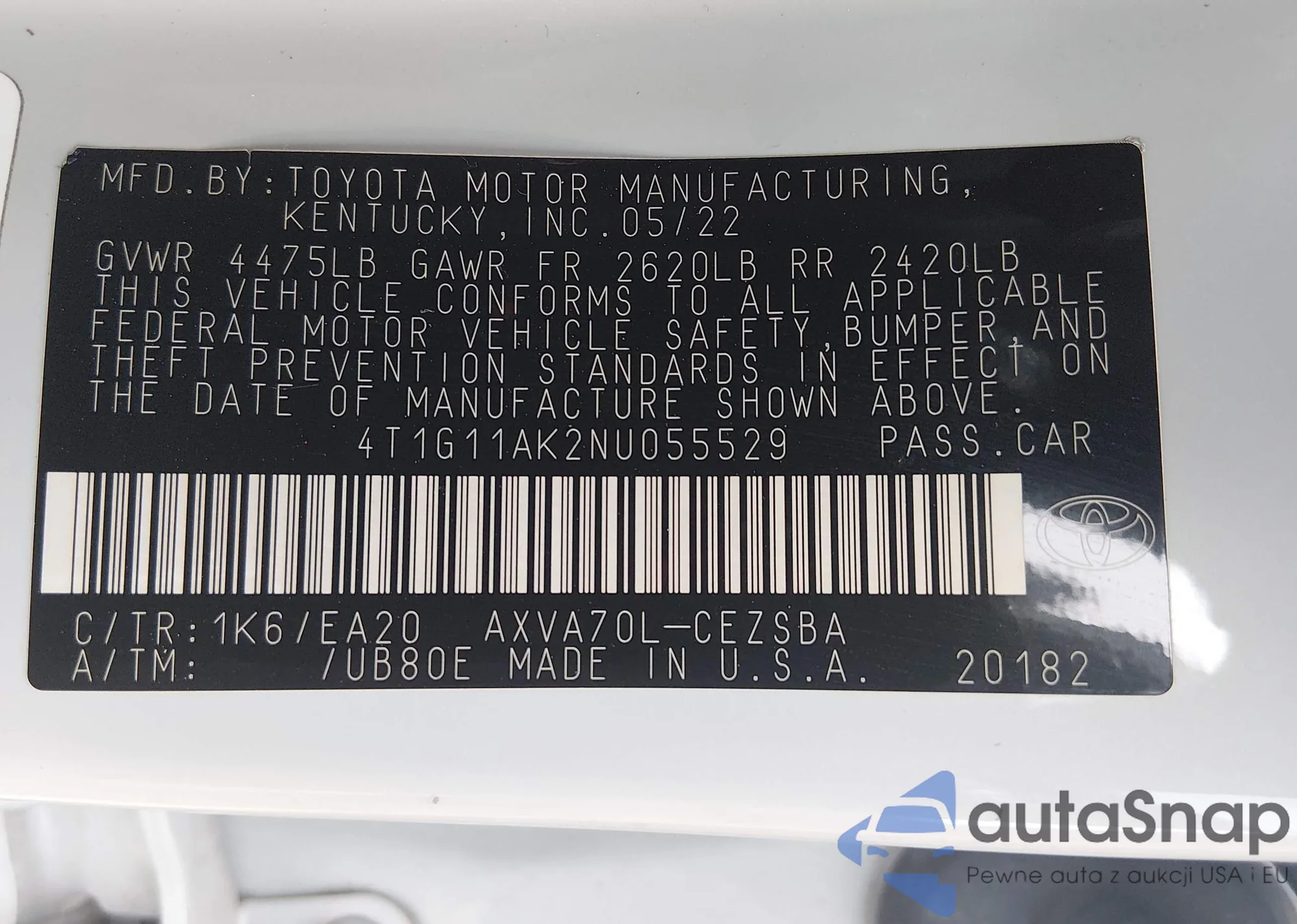 • VIN 4T1G11AK2NU055529