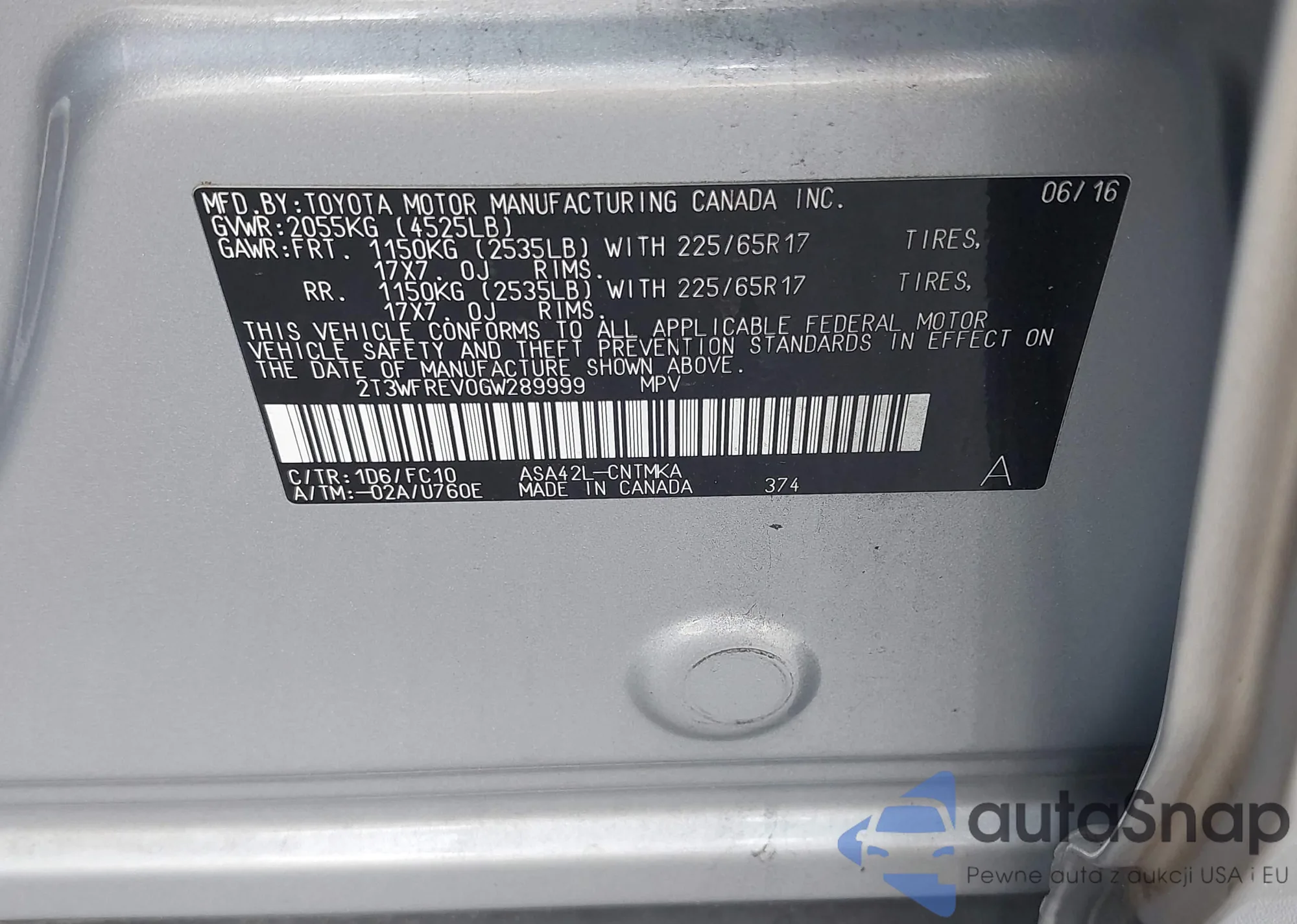 LOT: 42624817 VIN: 2T3WFREV0GW289999