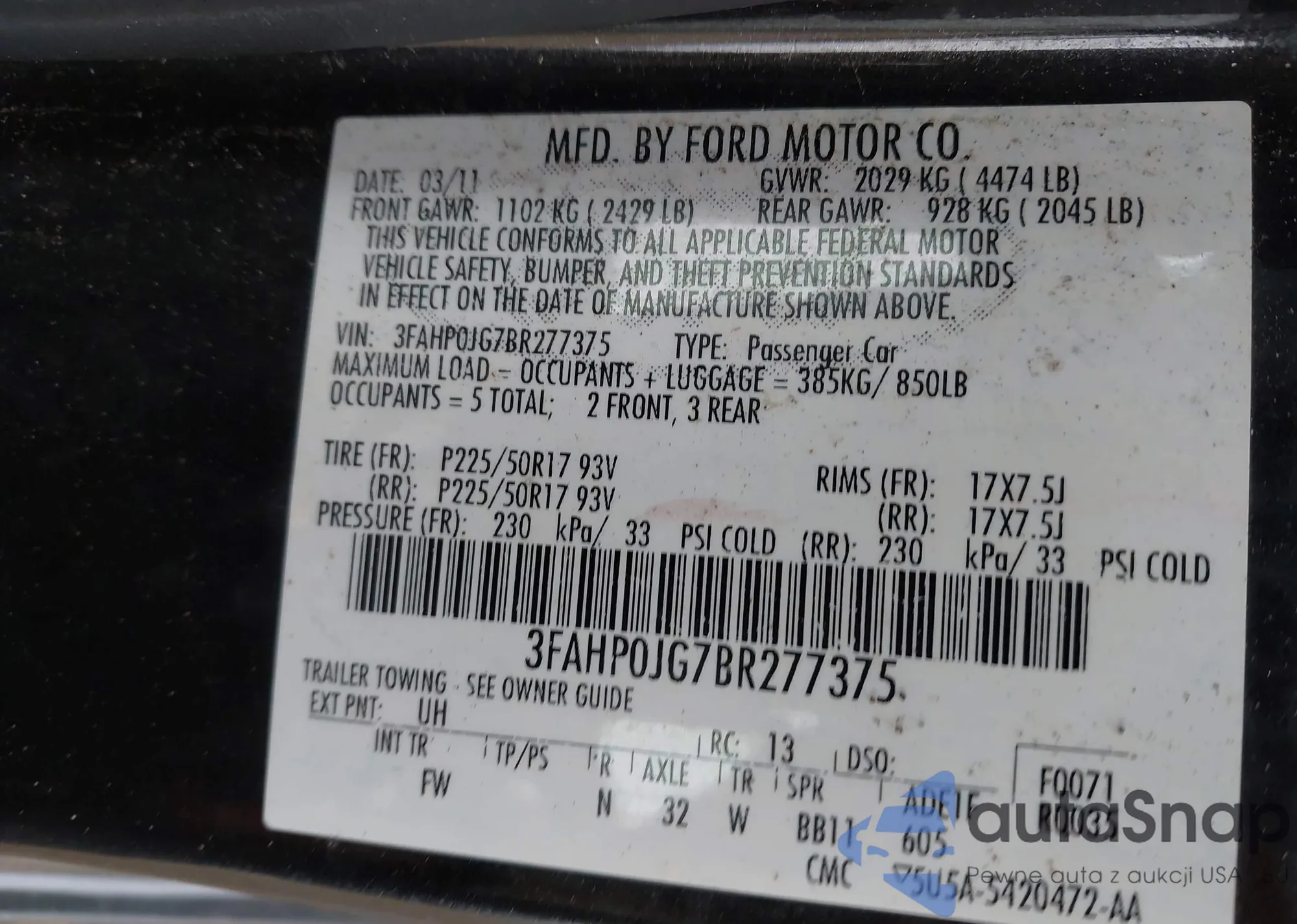 • VIN 3FAHP0JG7BR277375