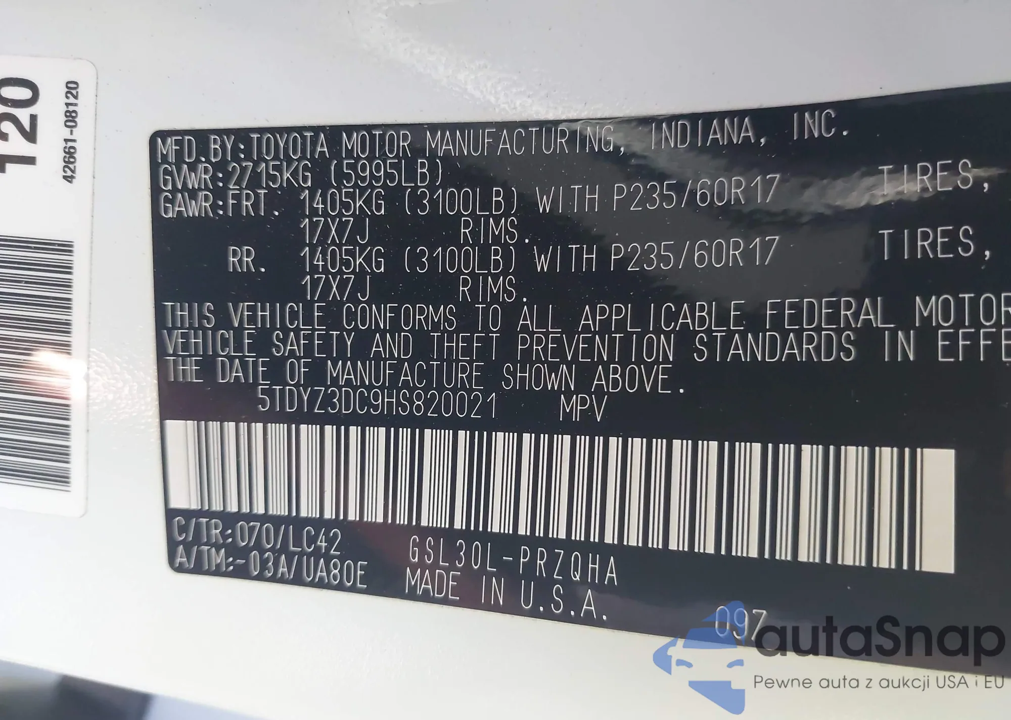 • VIN 5TDYZ3DC9HS820021