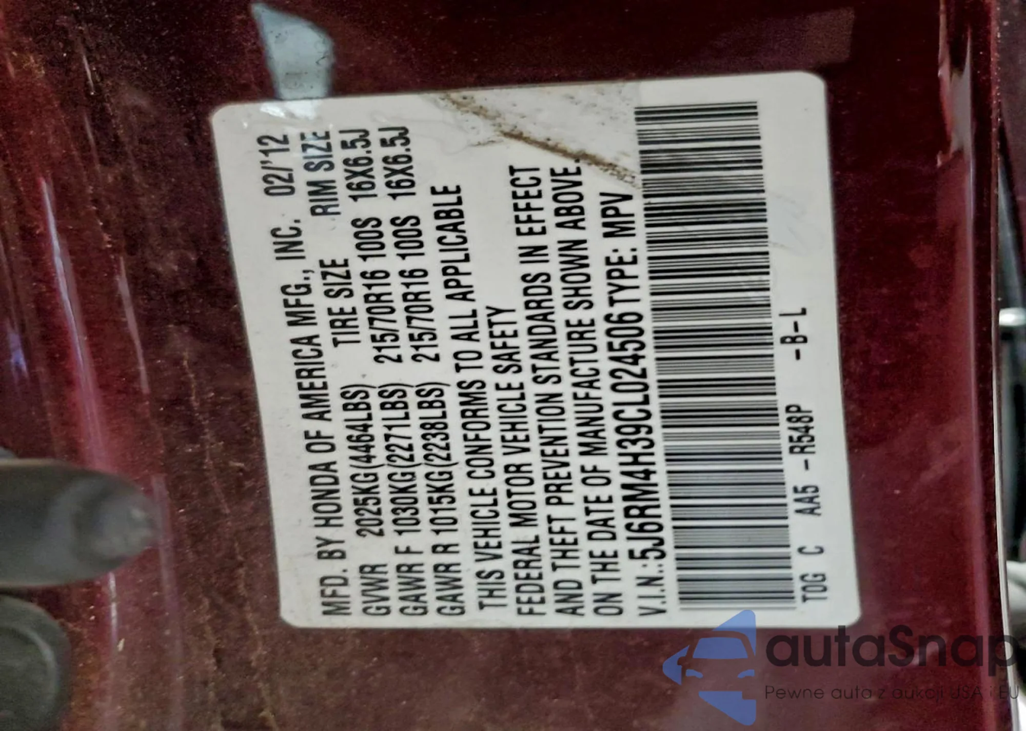 • VIN 5J6RM4H39CL024506