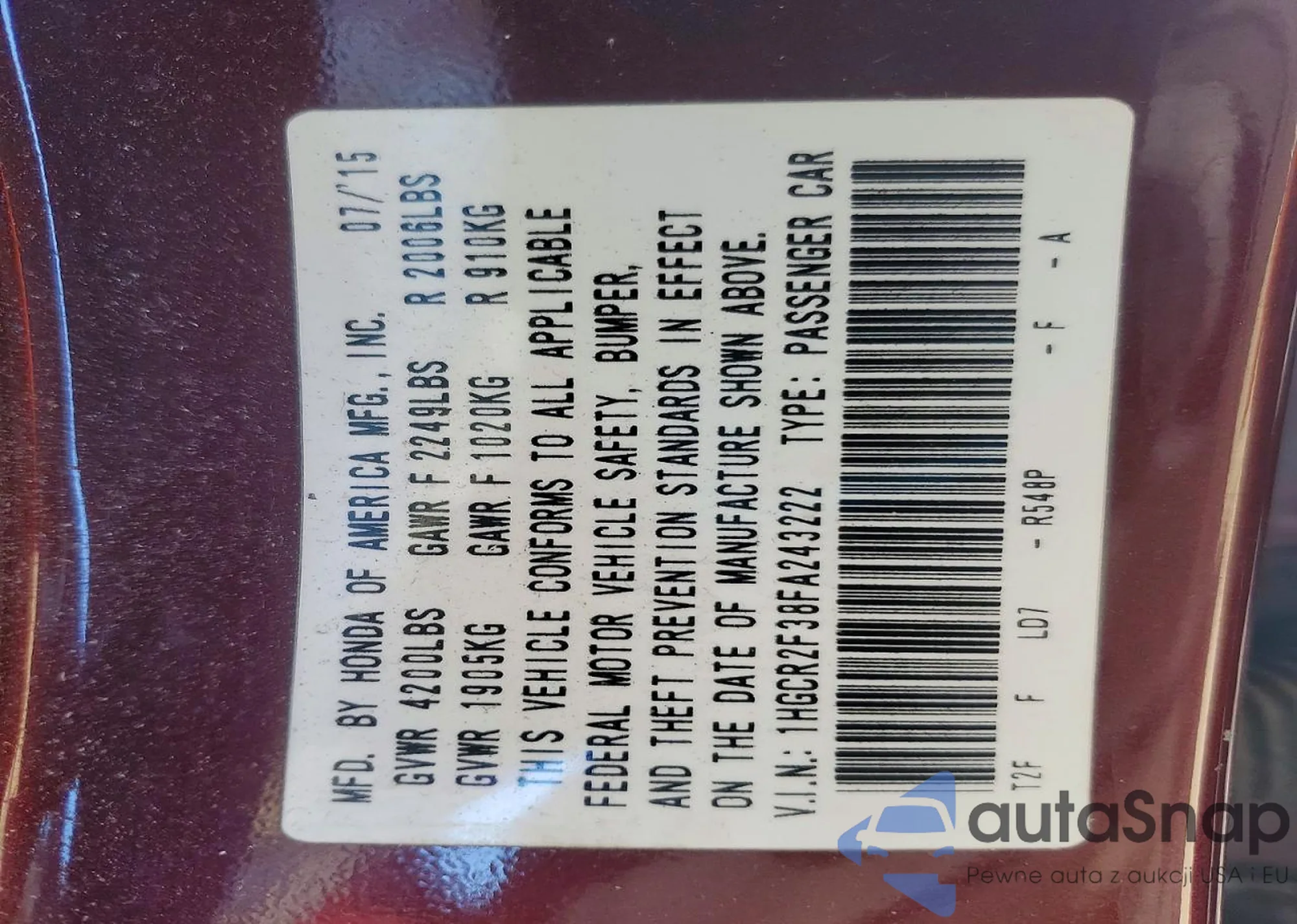 LOT: 74293305 VIN: 1HGCR2F38FA243222