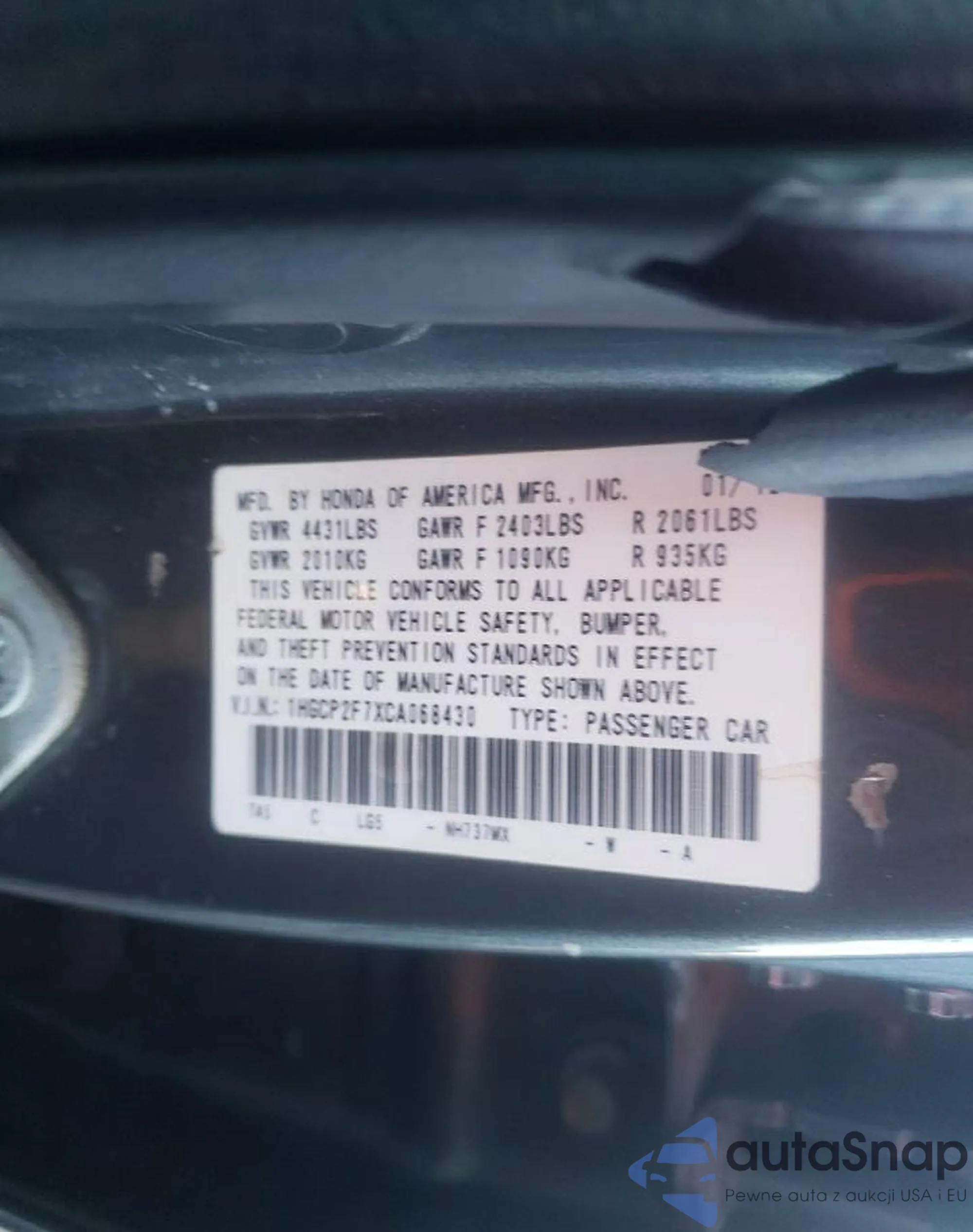 LOT: 75165935 VIN: 1HGCP2F7XCA068430