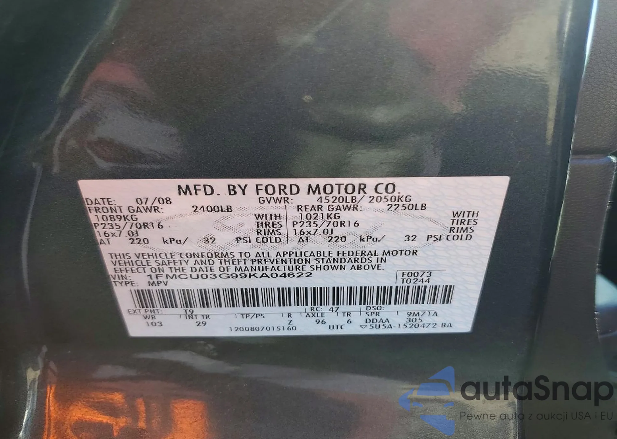 LOT: 76237775 VIN: 1FMCU03G99KA04622