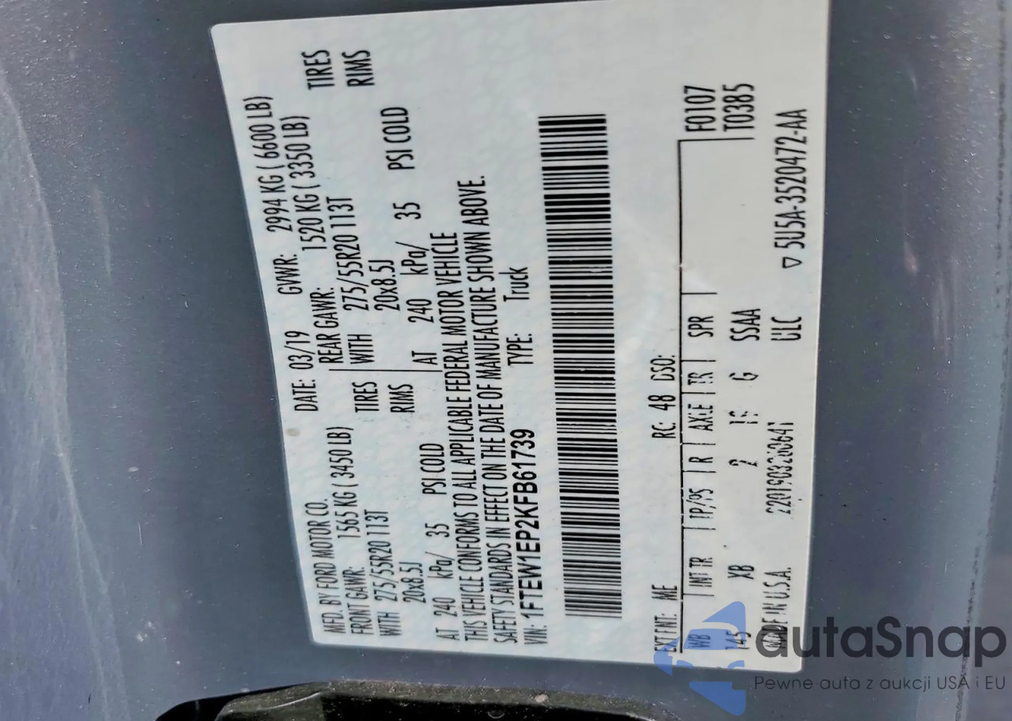 LOT: 72482995 VIN: 1FTEW1EP2KFB61739