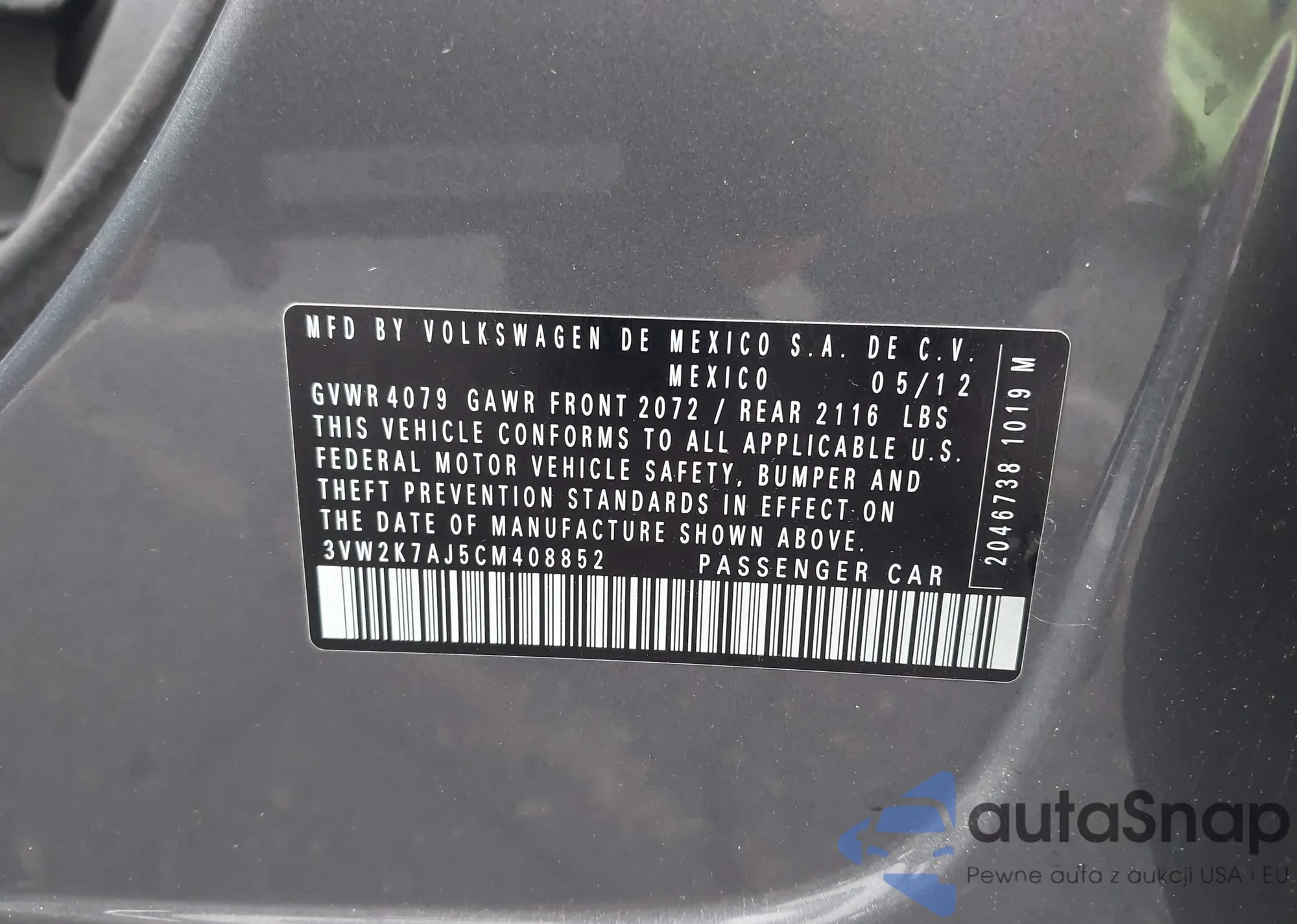 • VIN 3VW2K7AJ5CM408852