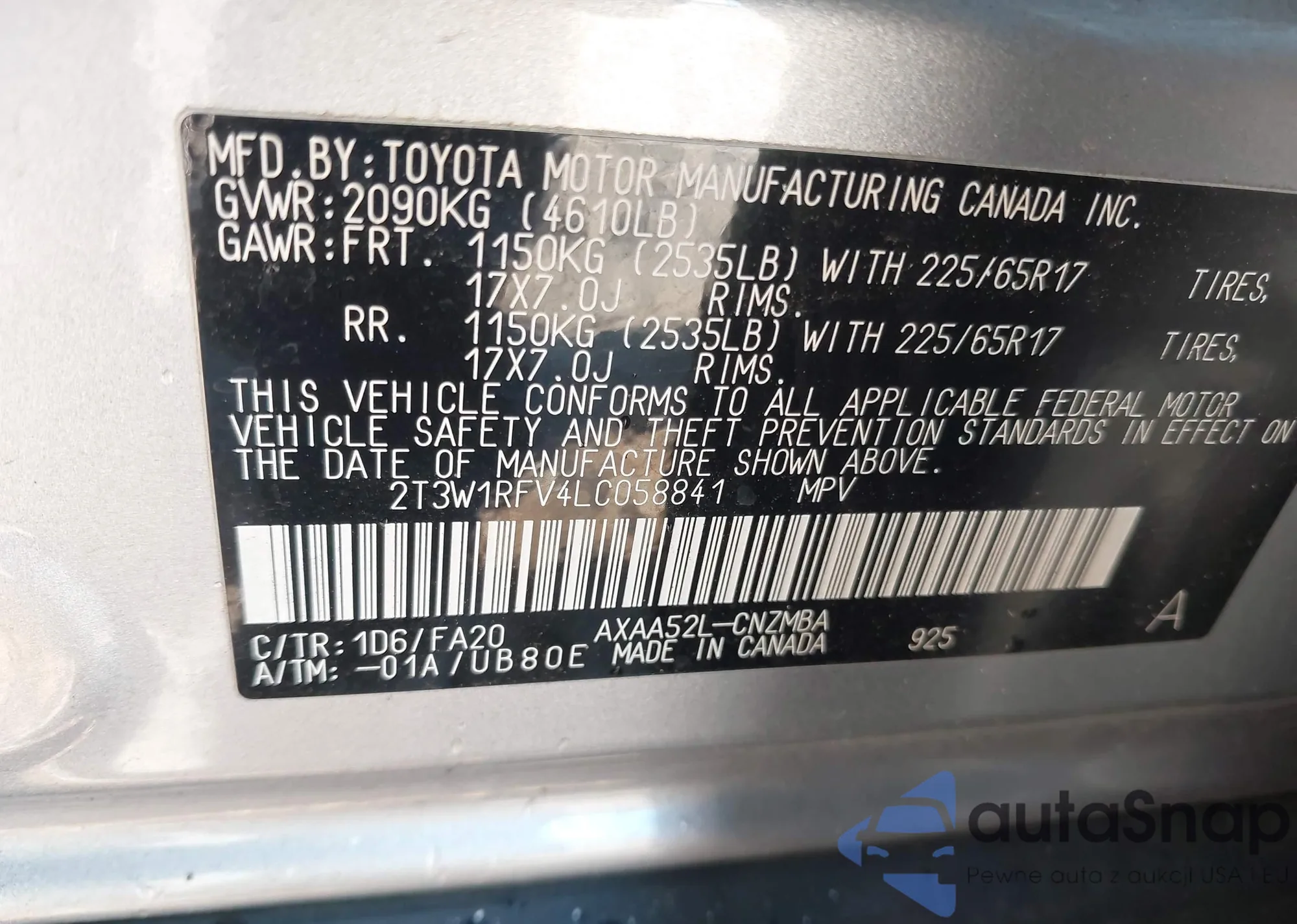 LOT: 44119375 VIN: 2T3W1RFV4LC058841