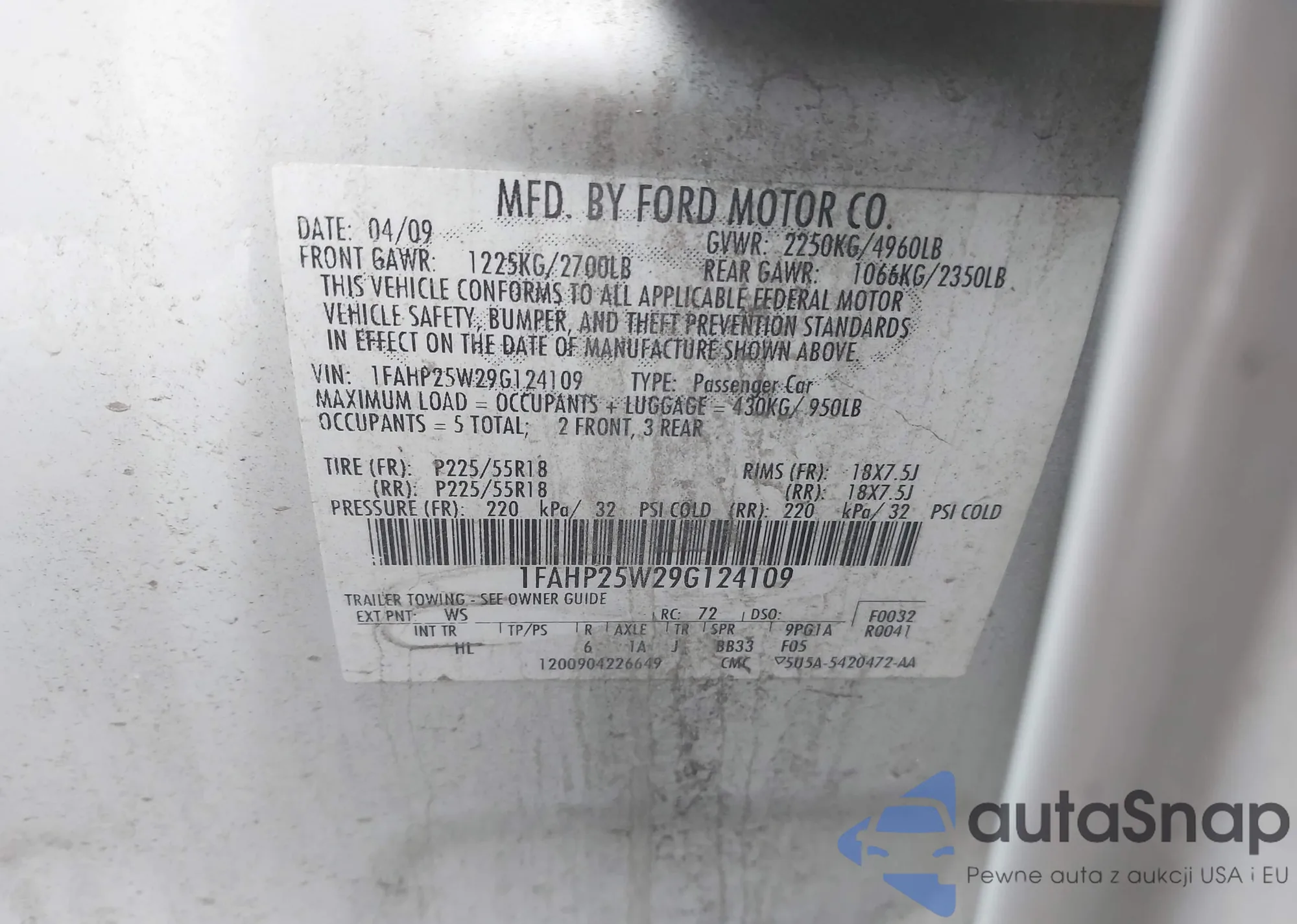 LOT: 44323212 VIN: 1FAHP25W29G124109