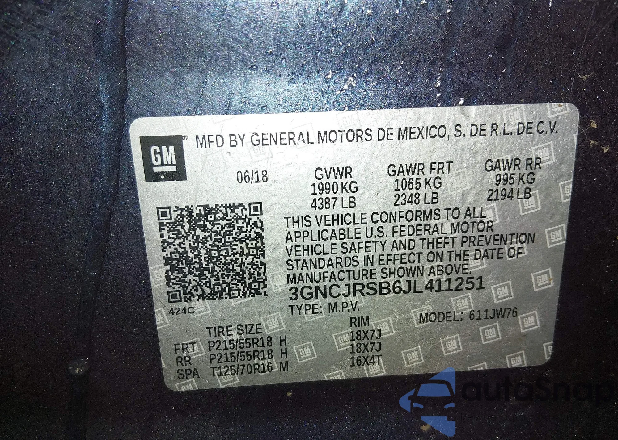 • VIN 3GNCJRSB6JL411251
