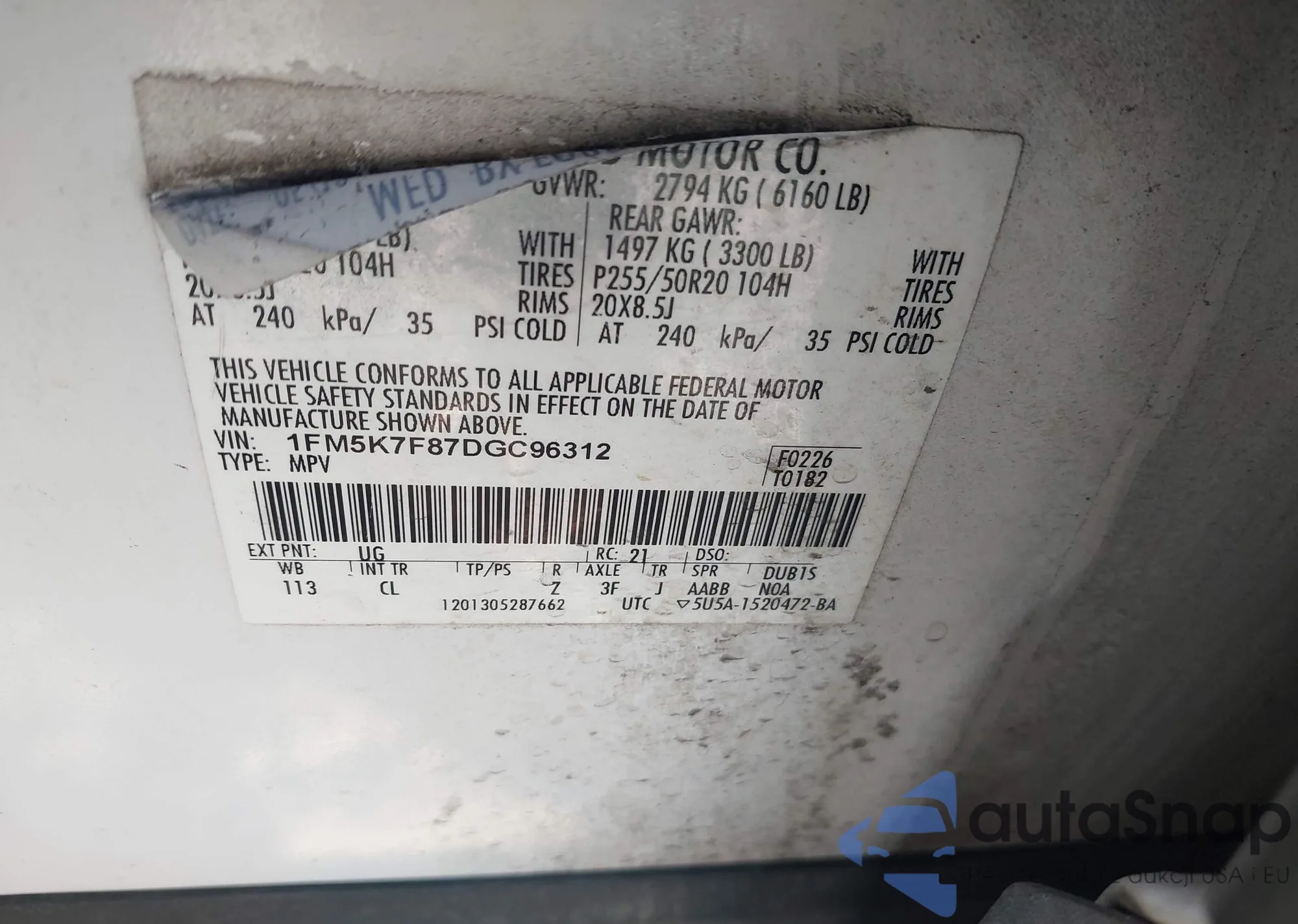 LOT: 44156133 VIN: 1FM5K7F87DGC96312