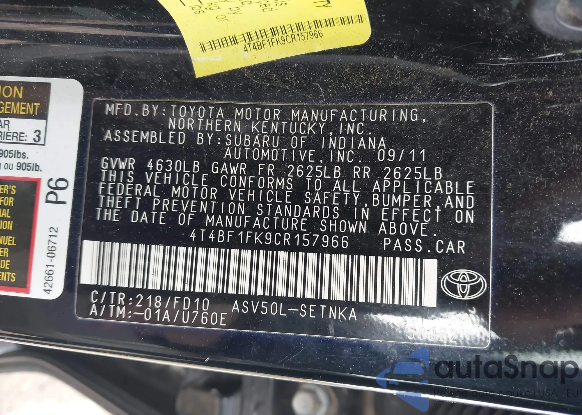 • VIN 4T4BF1FK9CR157966