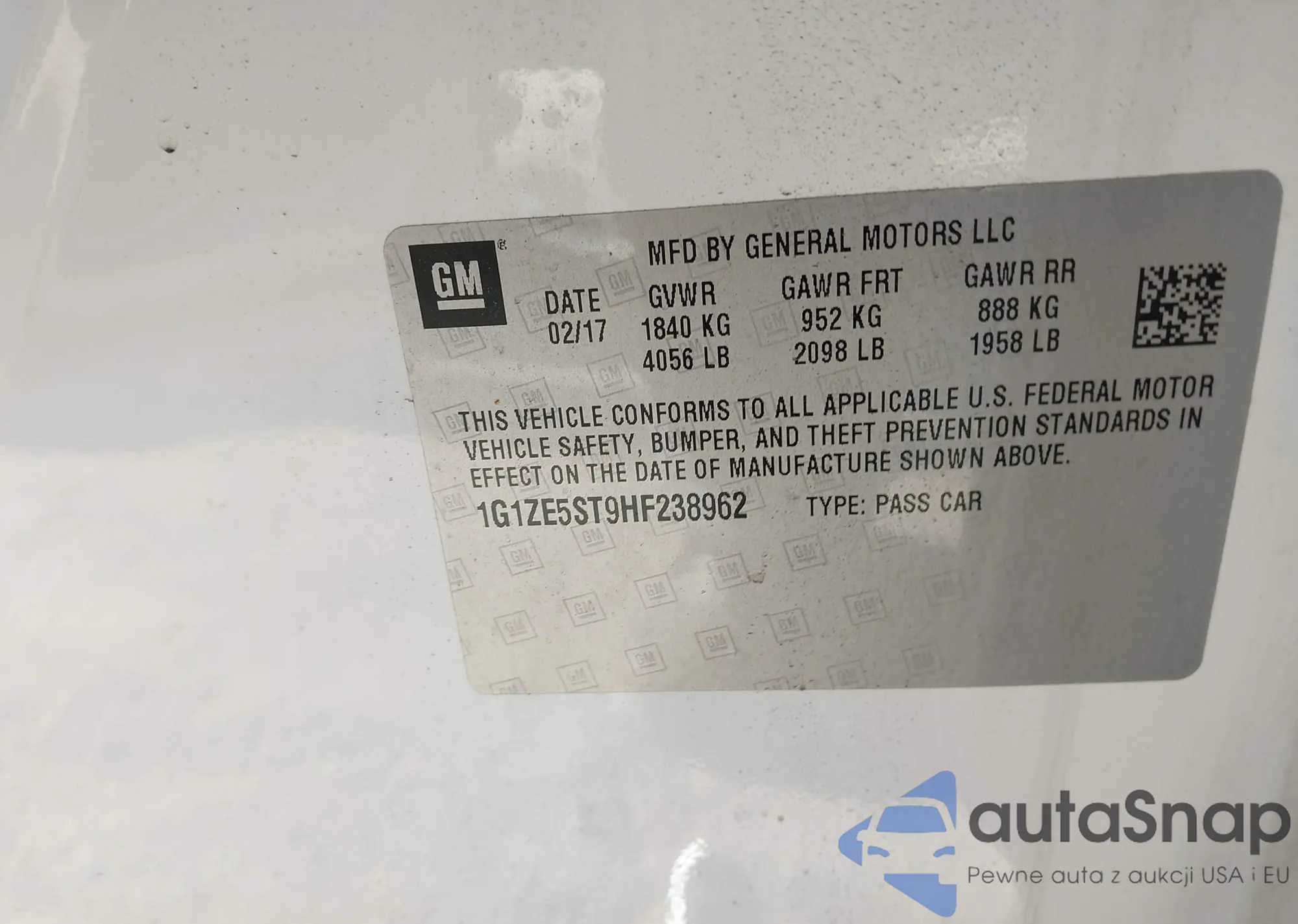 • VIN 1G1ZE5ST9HF238962