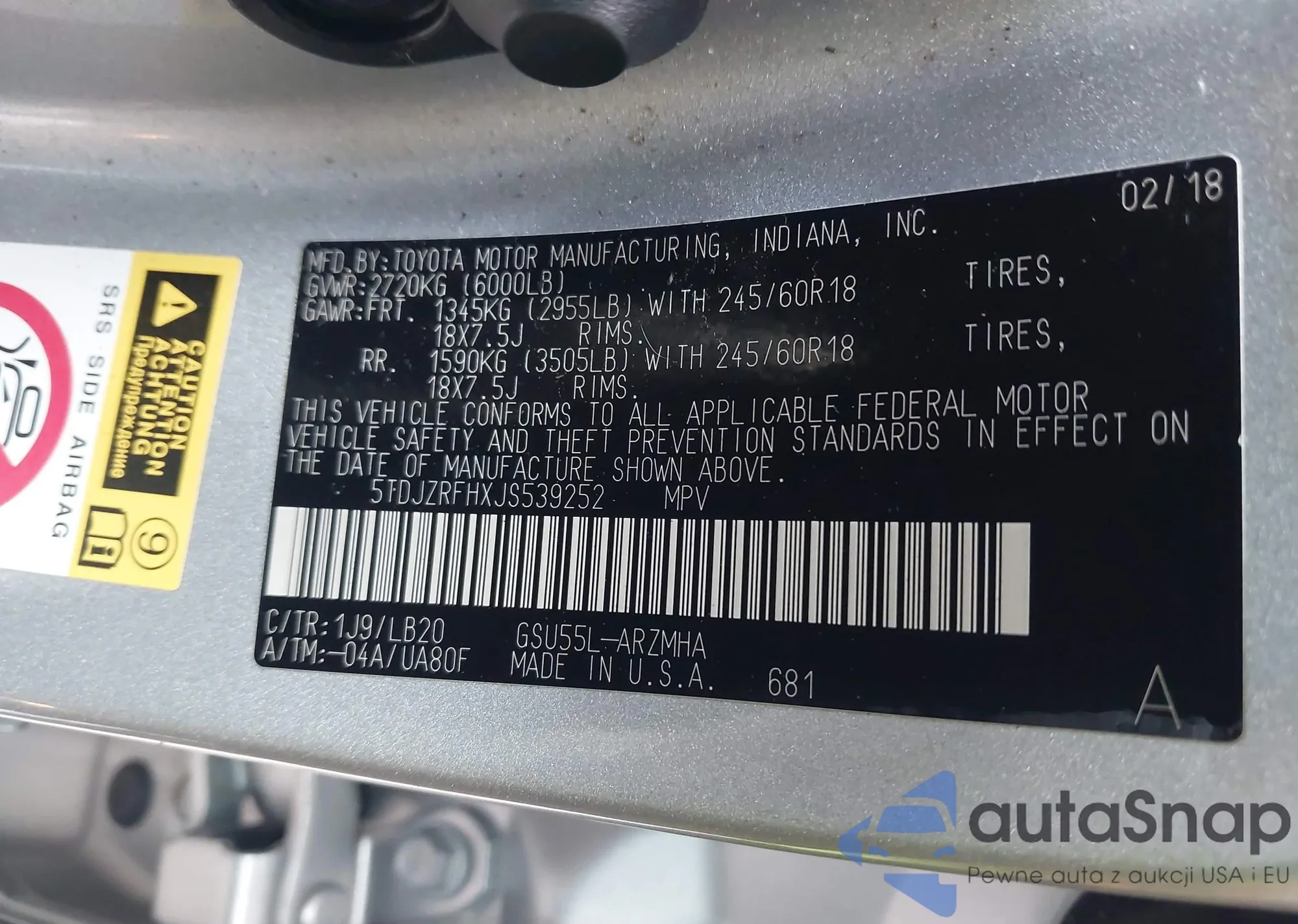 LOT: 43780375 VIN: 5TDJZRFHXJS539252