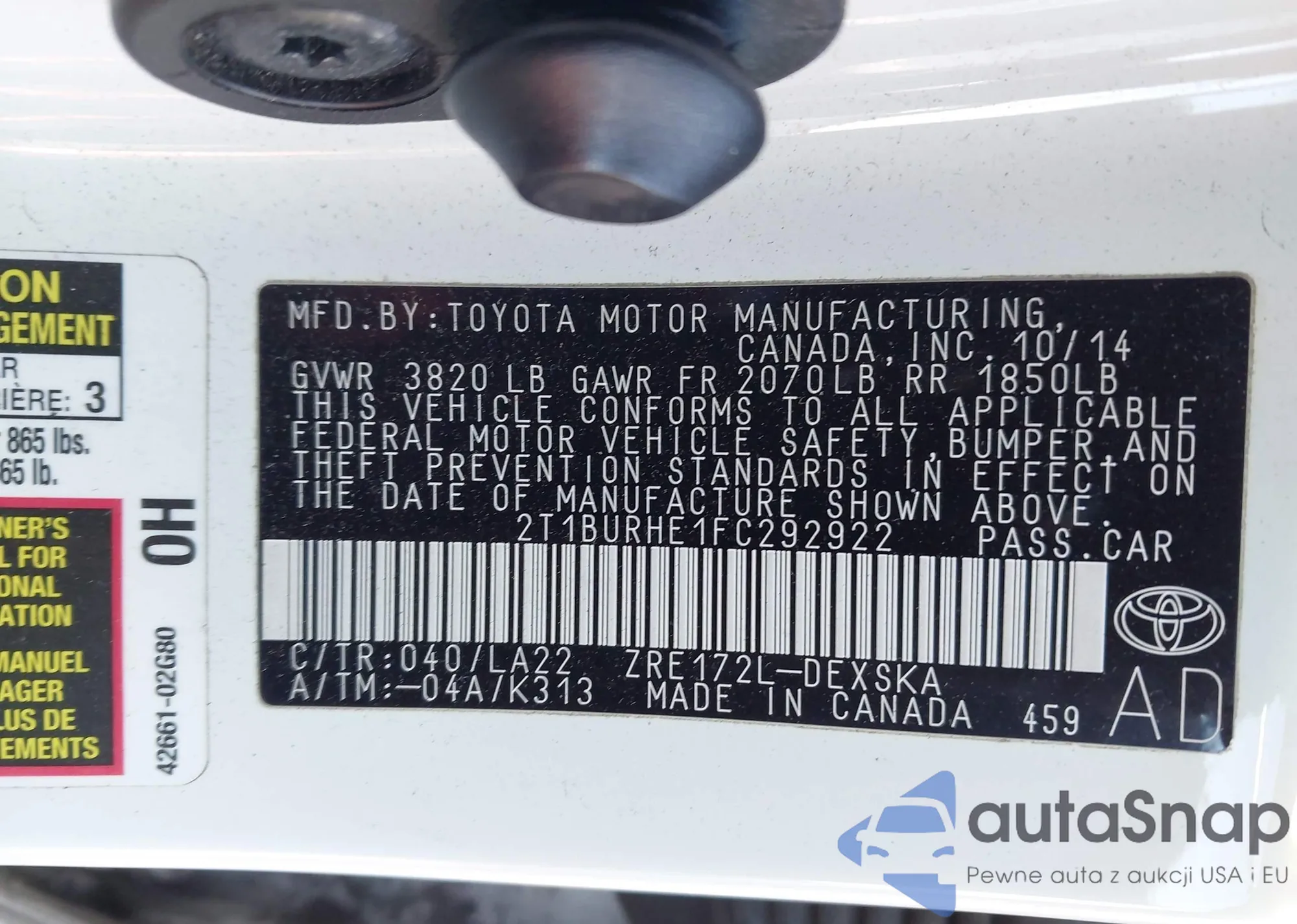 LOT: 44148478 VIN: 2T1BURHE1FC292922