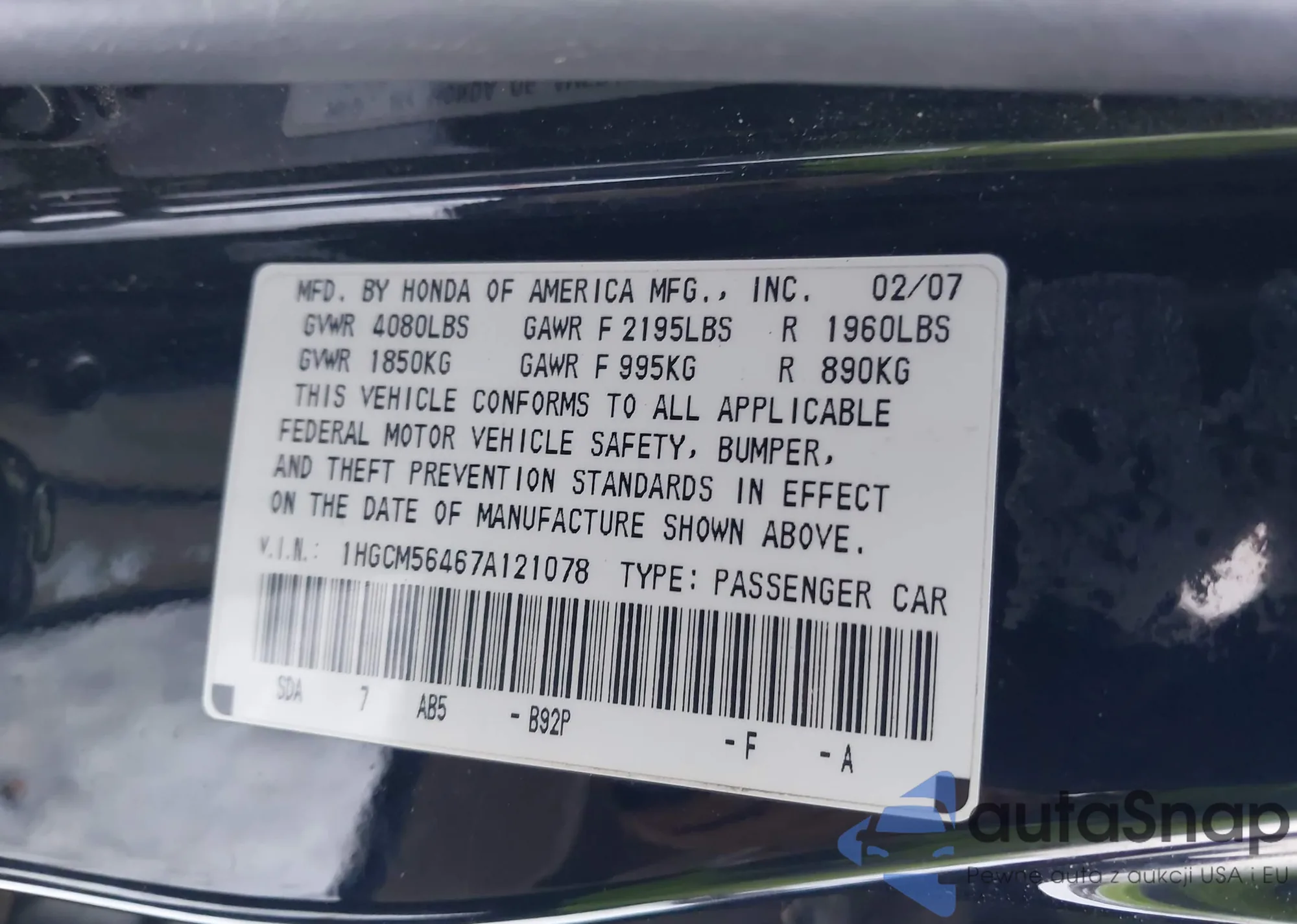 LOT: 44176737 VIN: 1HGCM56467A121078