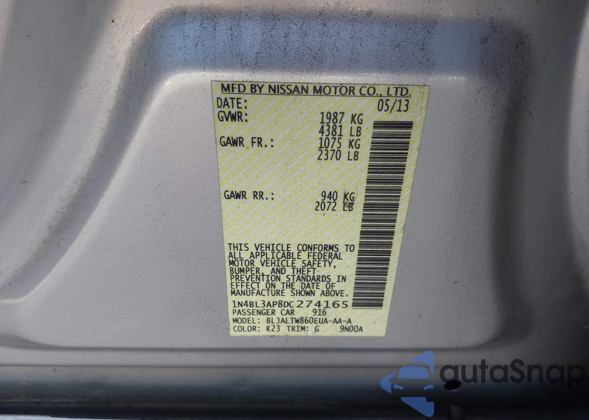 LOT: 44022103 VIN: 1N4BL3AP8DC274165