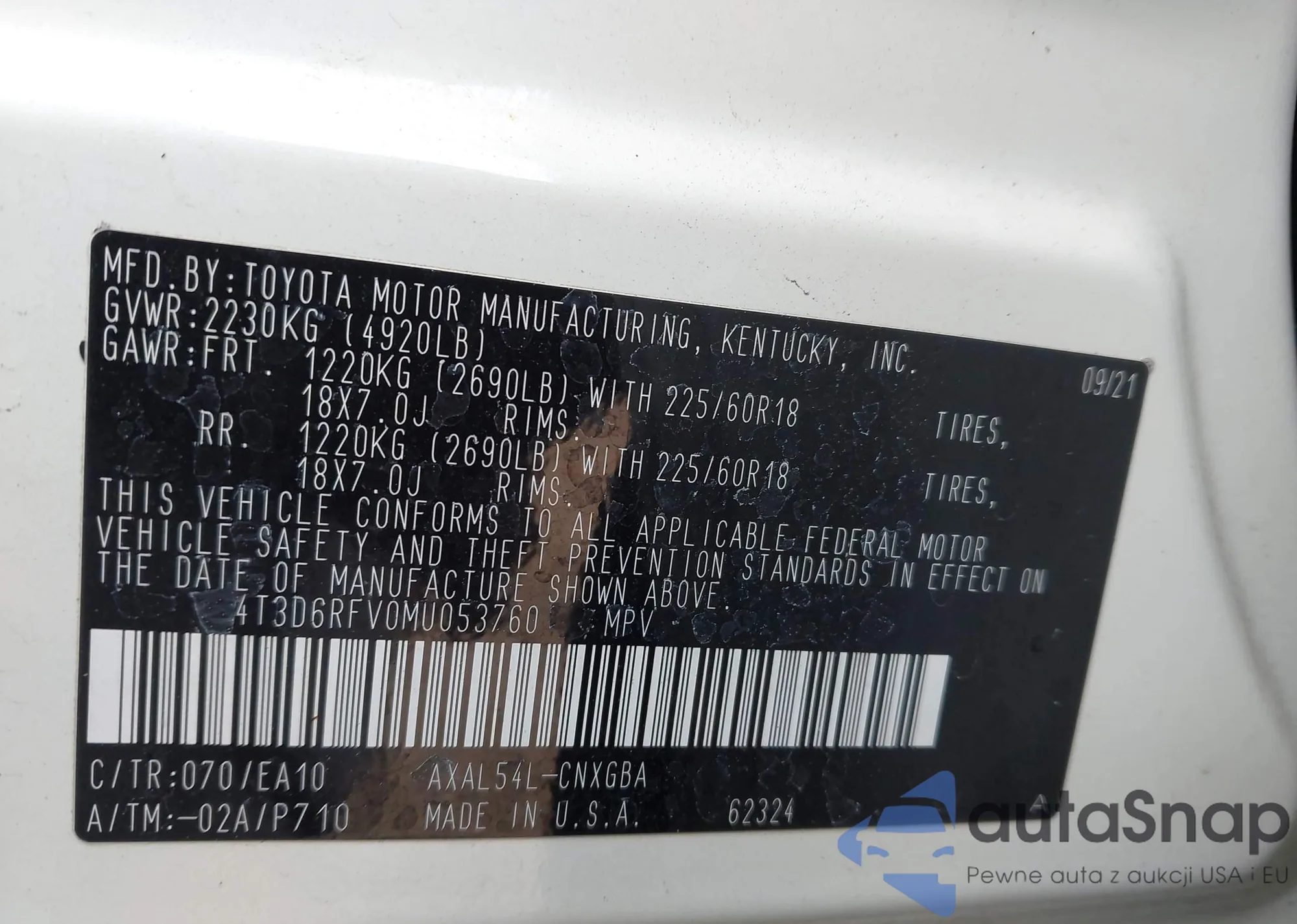 LOT: 44086870 VIN: 4T3D6RFV0MU053760