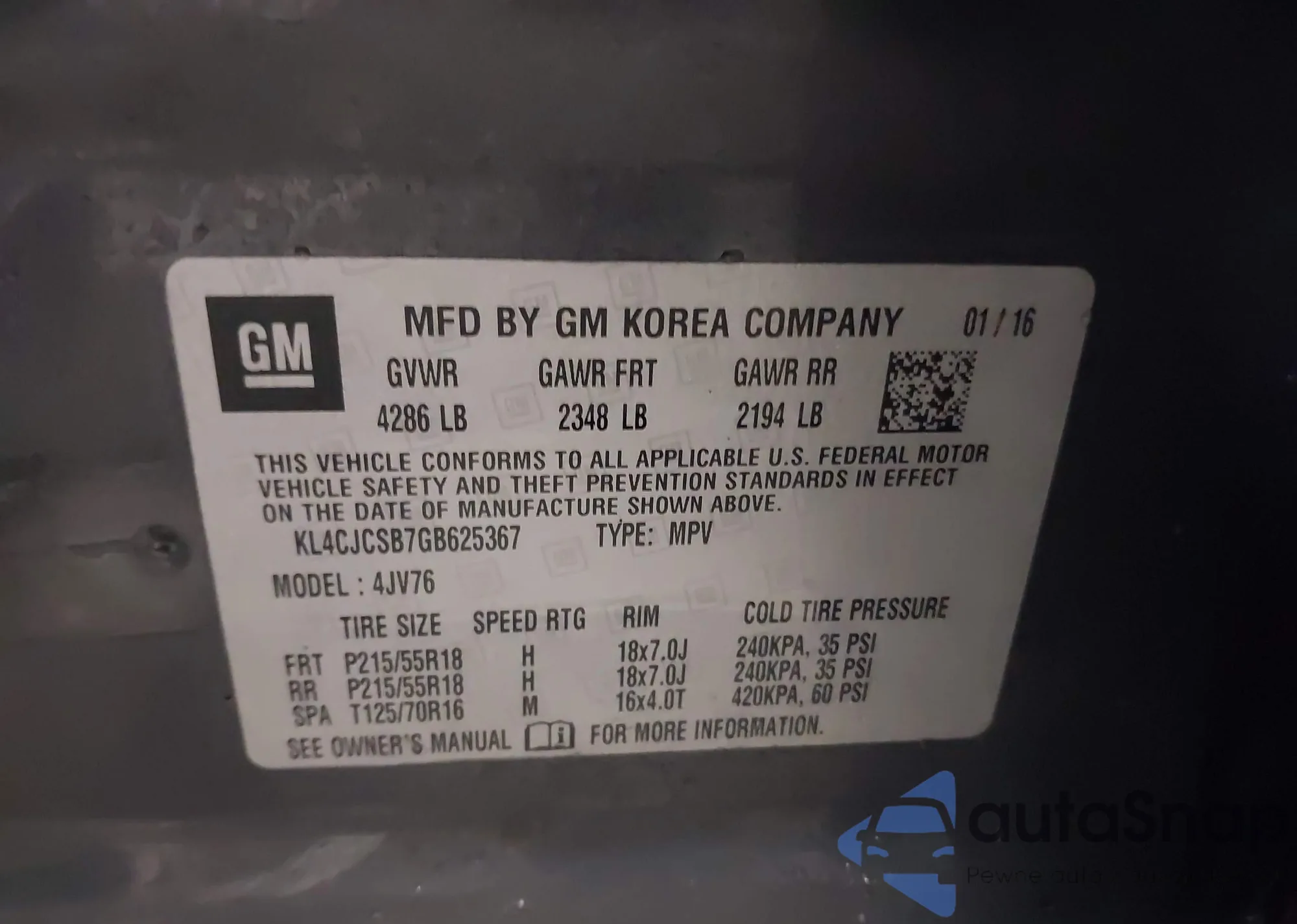 • VIN KL4CJCSB7GB625367