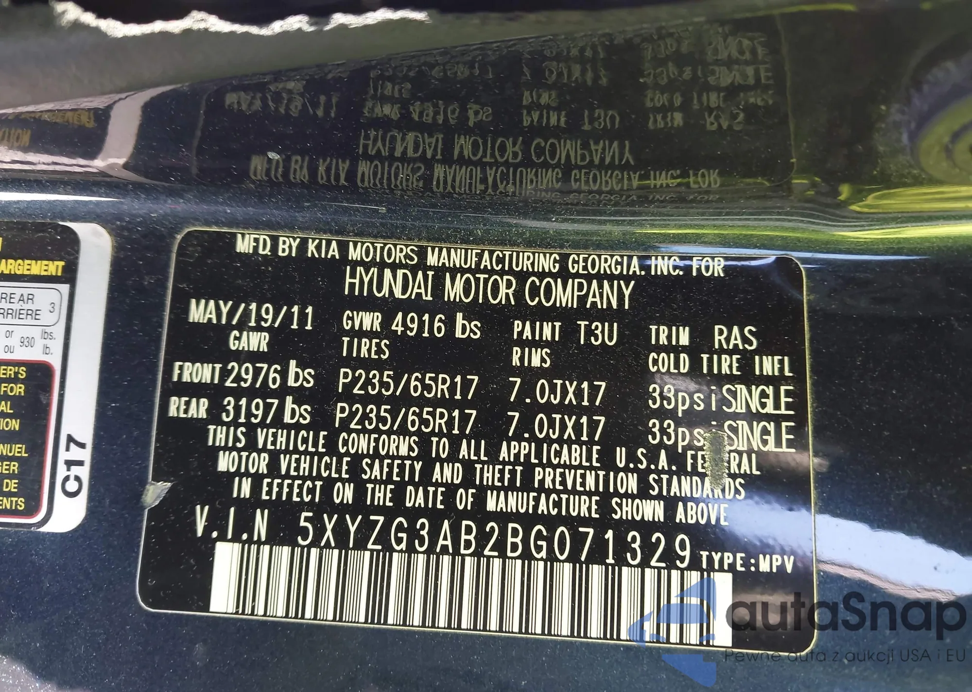 • VIN 5XYZG3AB2BG071329