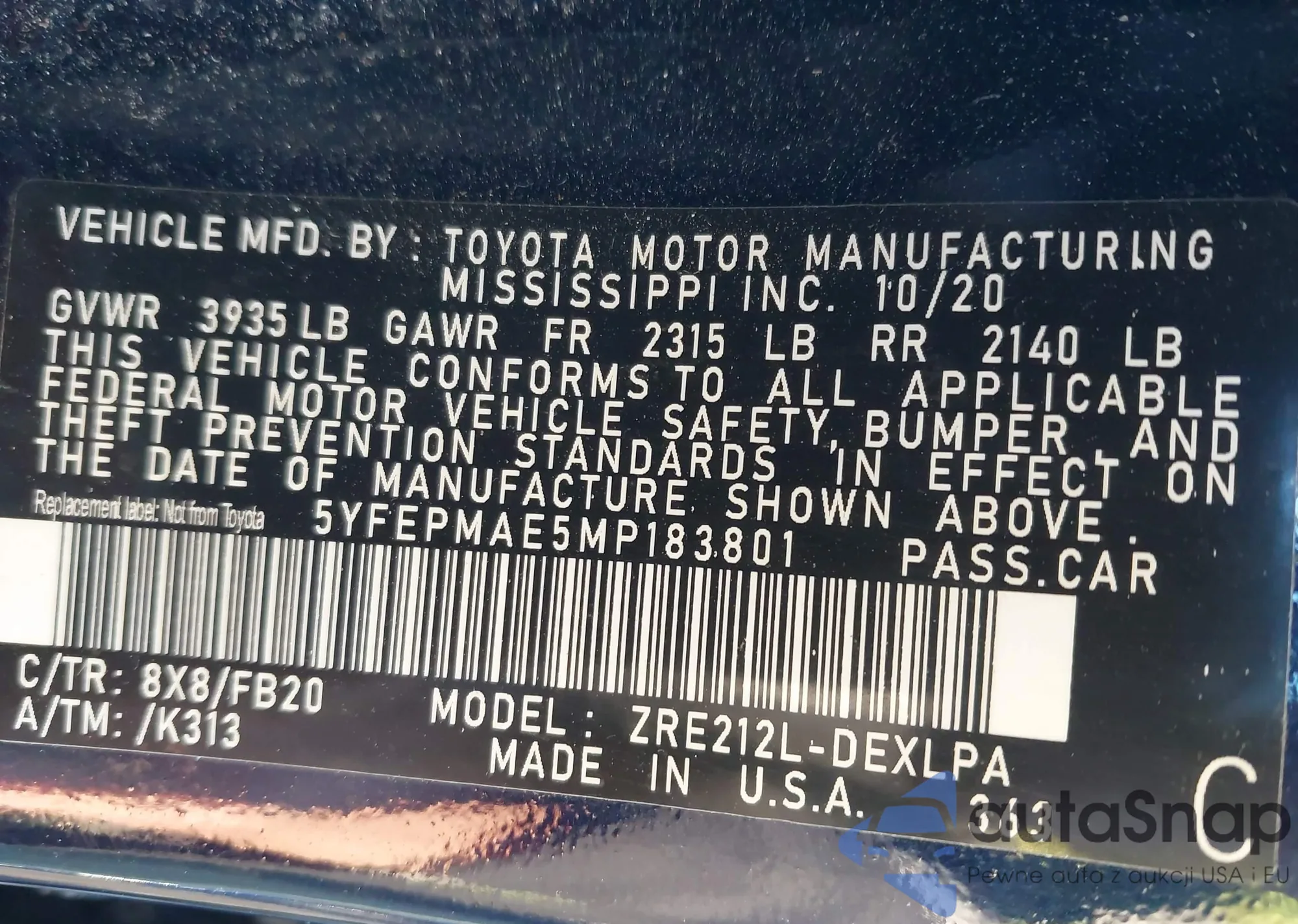 LOT: 44110034 VIN: 5YFEPMAE5MP183801