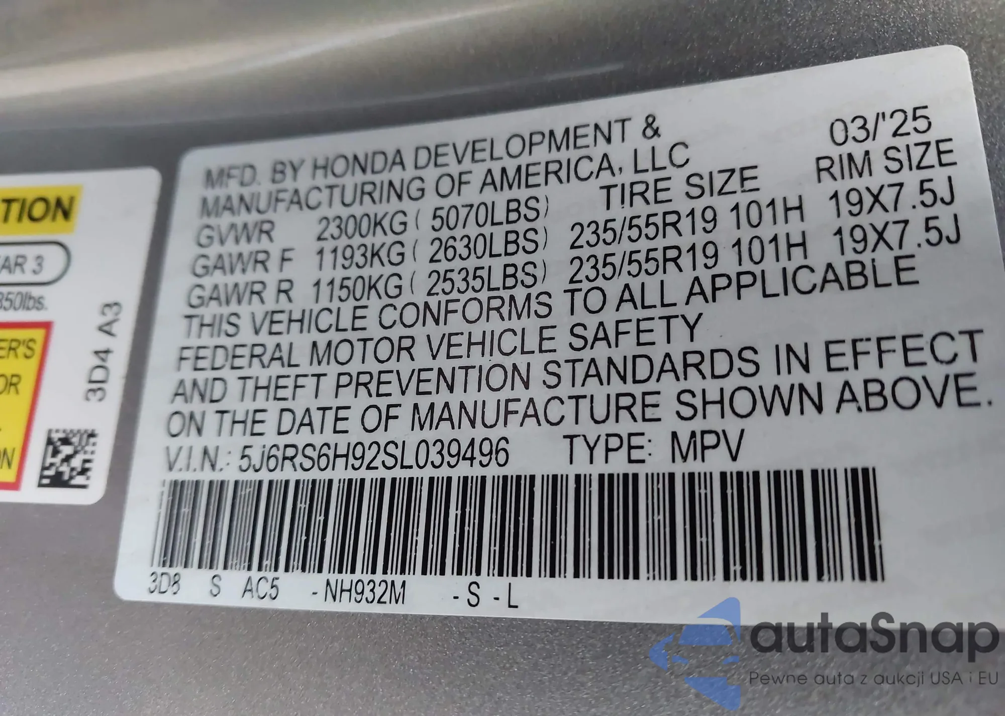 • VIN 5J6RS6H92SL039496