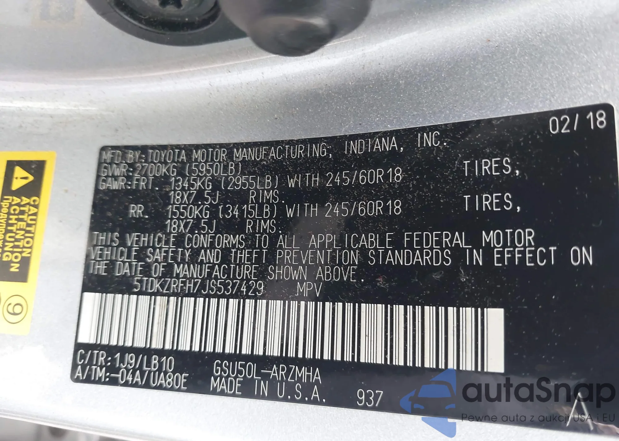 • VIN 5TDKZRFH7JS537429