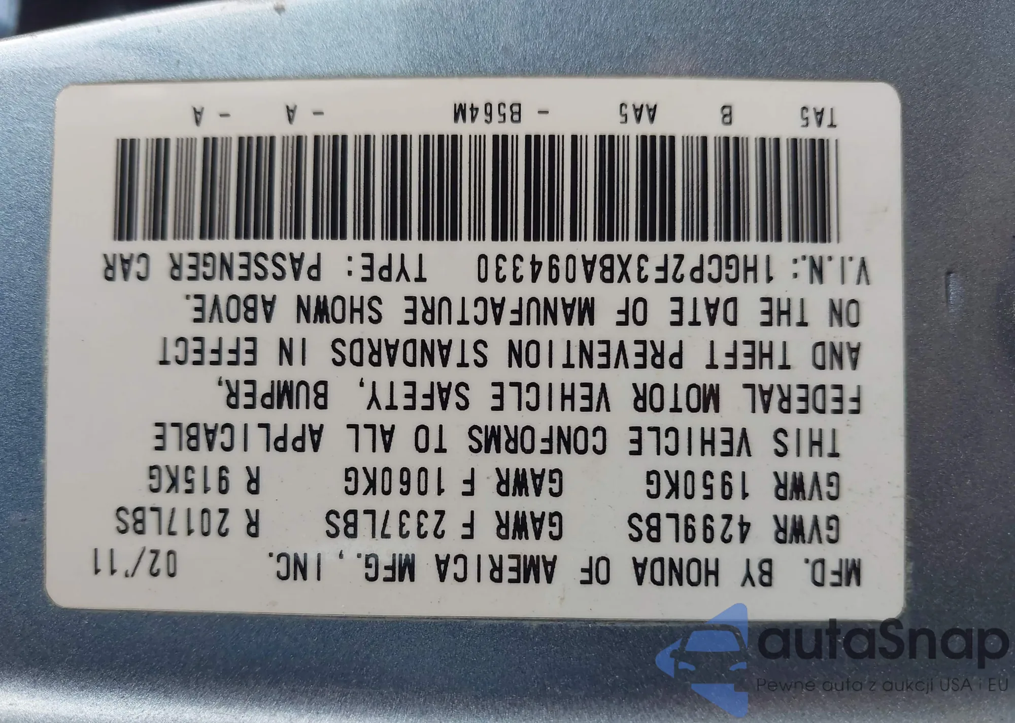 LOT: 44332487 VIN: 1HGCP2F3XBA094330