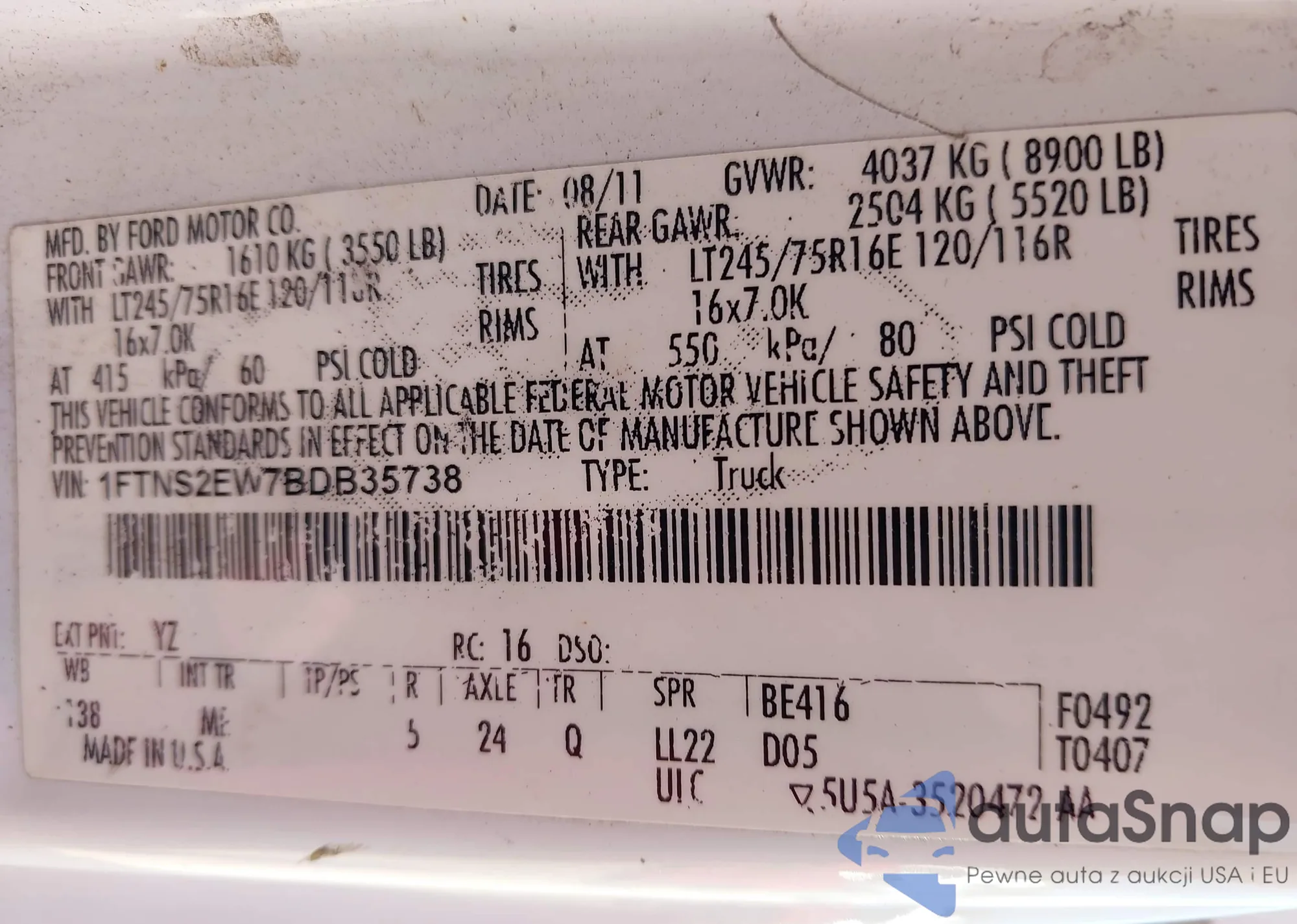 LOT: 44304587 VIN: 1FTNS2EW7BDB35738