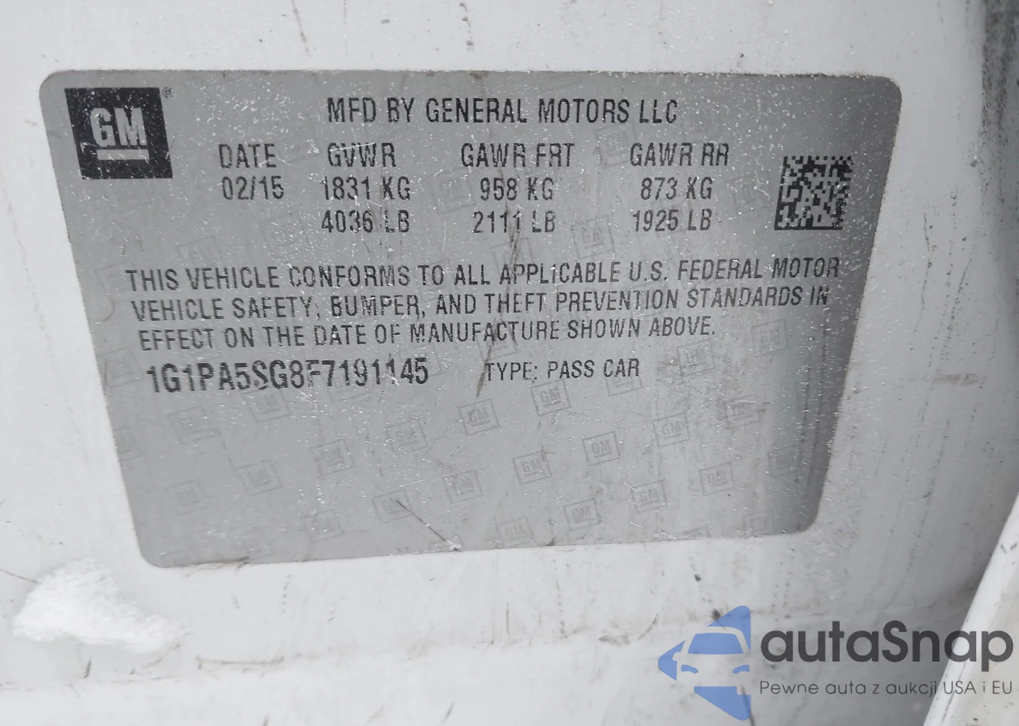 LOT: 44289092 VIN: 1G1PA5SG8F7191145