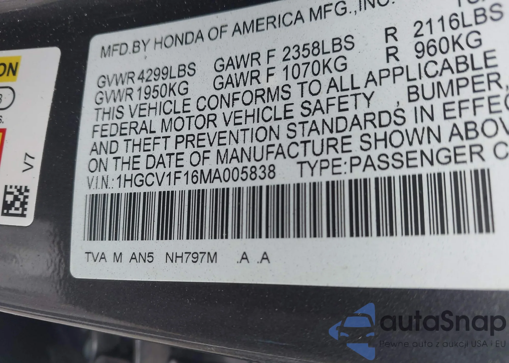 • VIN 1HGCV1F16MA005838