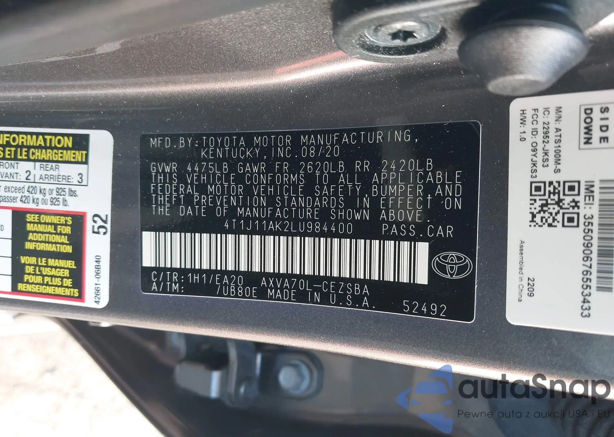 LOT: 44094218 VIN: 4T1J11AK2LU984400