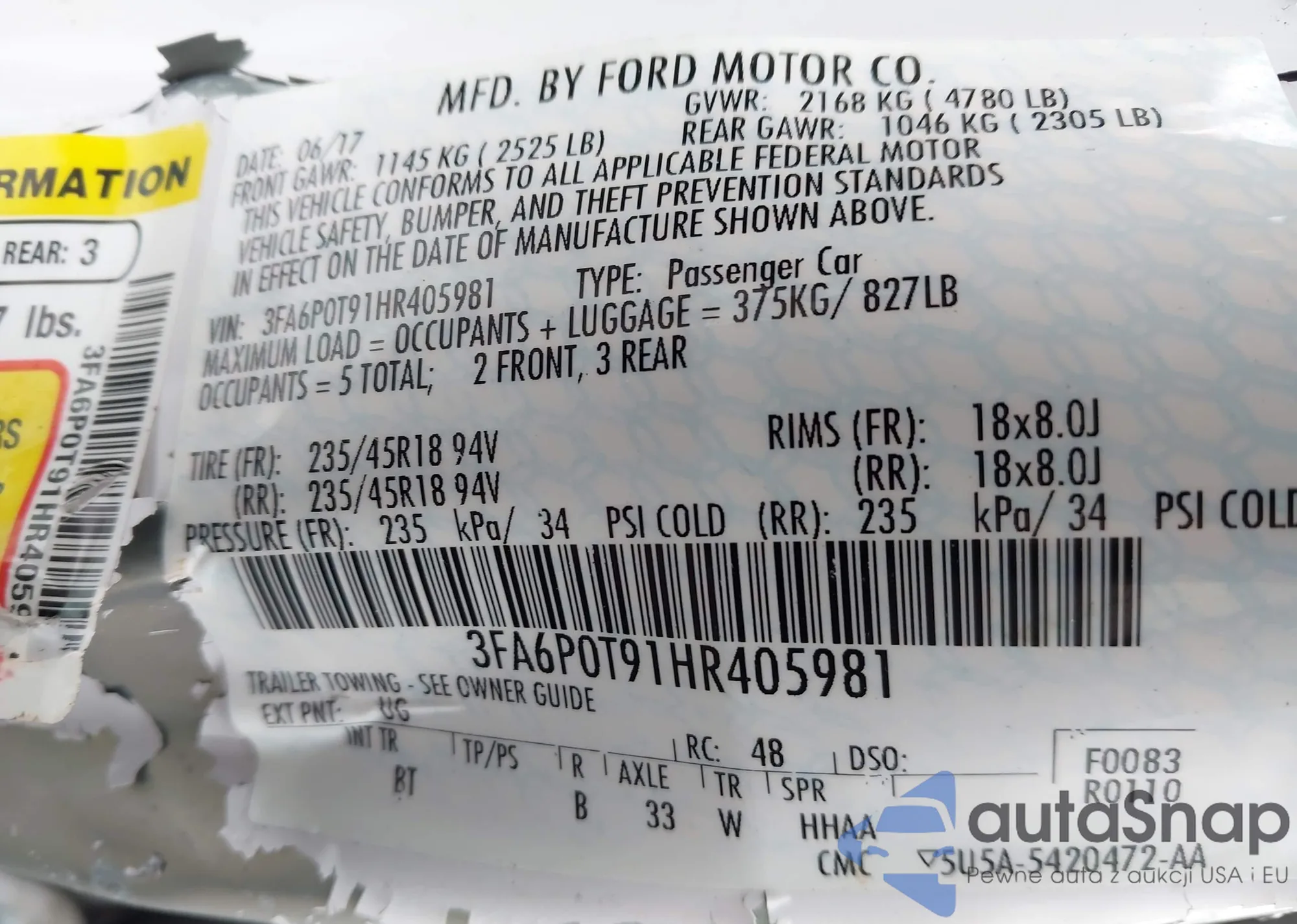 LOT: 44292158 VIN: 3FA6P0T91HR405981