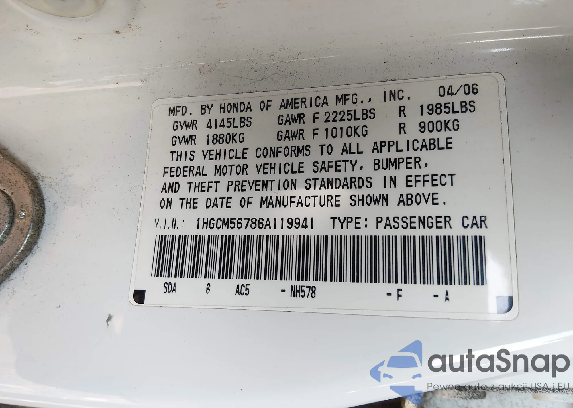 LOT: 44209618 VIN: 1HGCM56786A119941